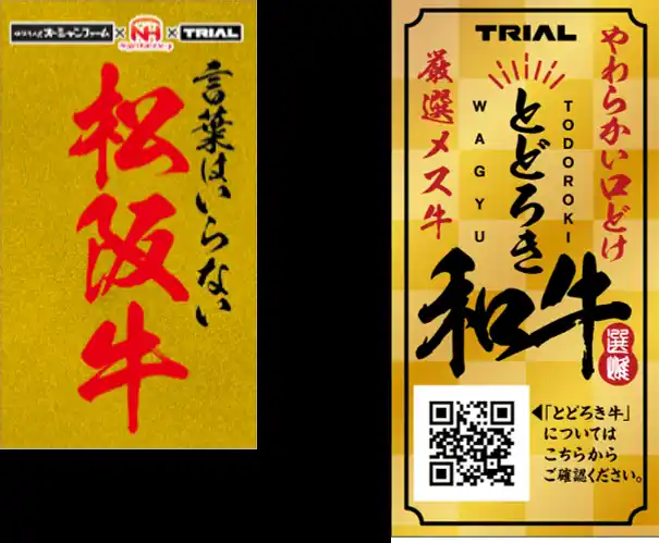 A5ランクの「松阪牛」や「金華豚」といったハイブランド肉に加え、トライアルが長年培った独自基準で厳選した自社精肉ブランド「とどろき牛」「とどろき和牛」を展開します。 |