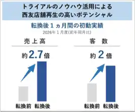 その結果、転換後わずか1カ月の実績(2026年1月度/前年同月比)において、売上高は約2.7倍、客数は約2倍と大幅な伸長を達成しています。 |