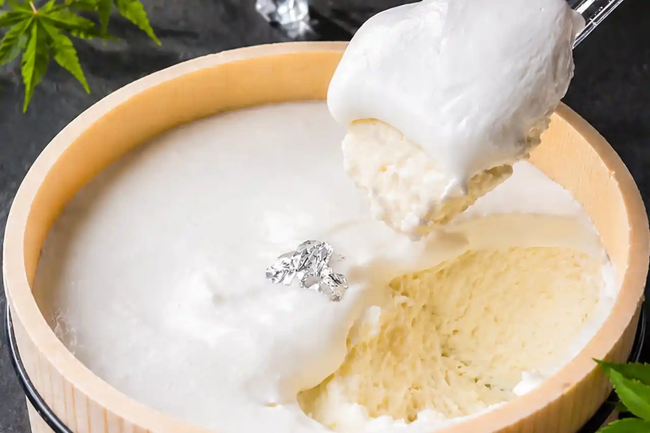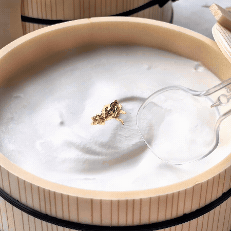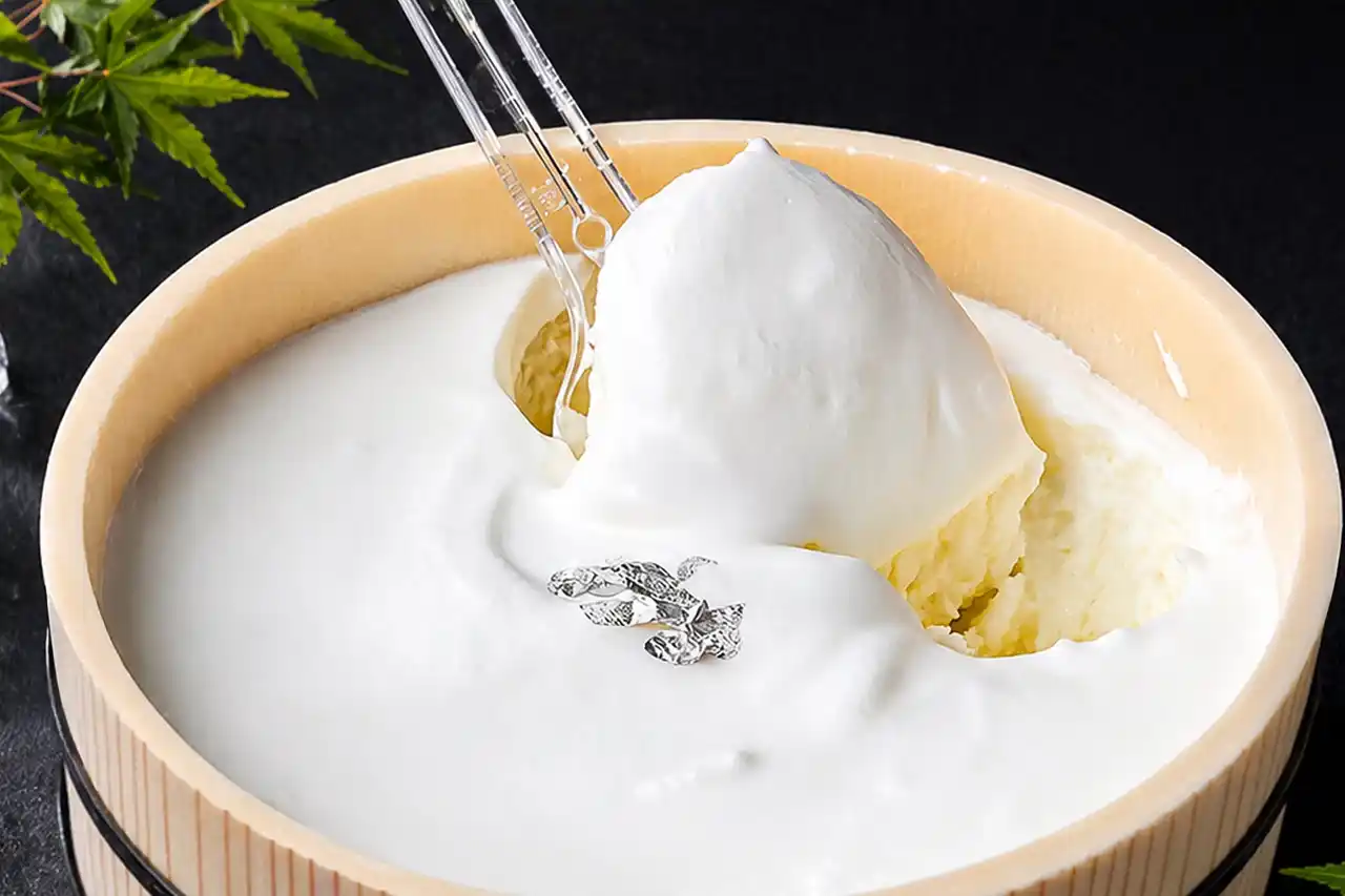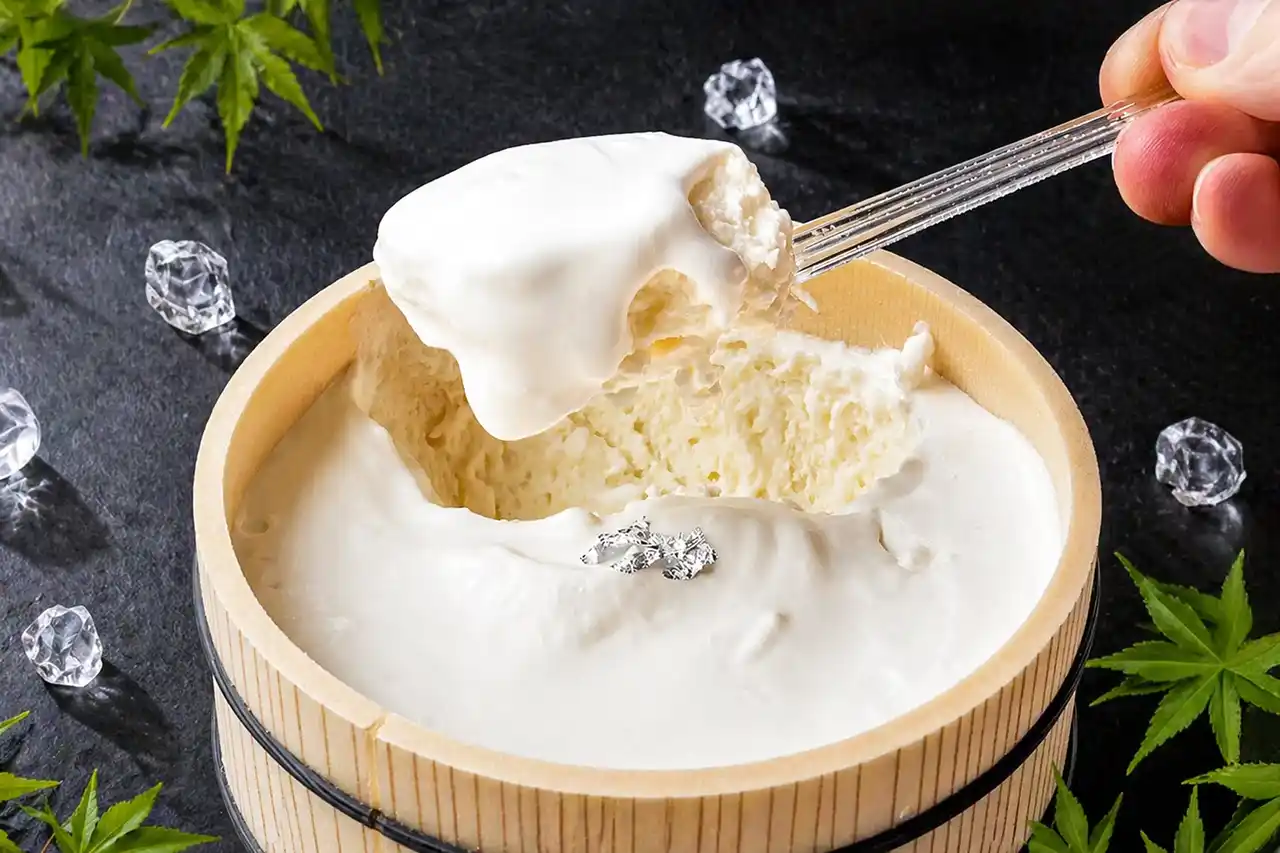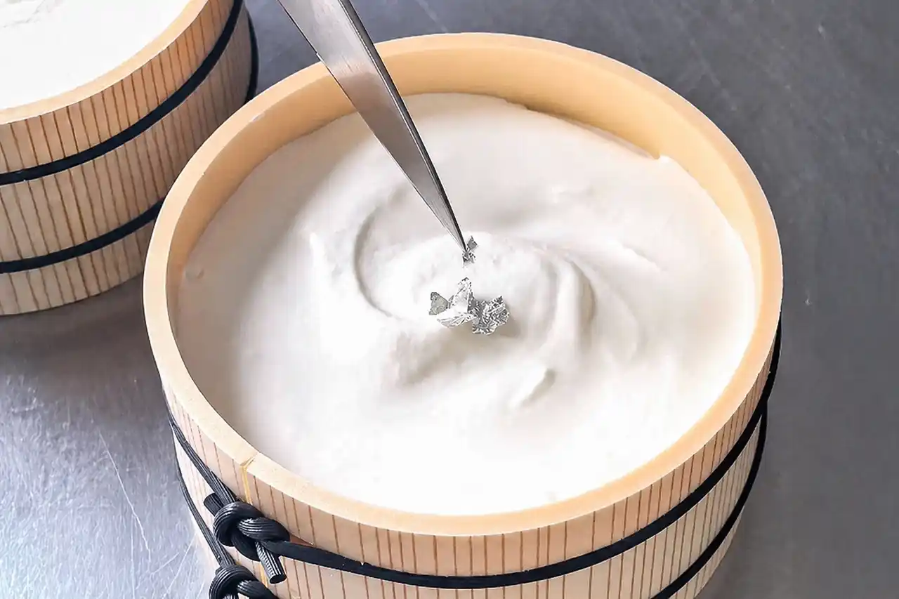 ふたを開けると、そこに現れるのは──真っ白な「絹の淡雪」。さらに、そっと添えられた涼しげな銀箔が、ひとさじの贅沢感を引き立てます。 |