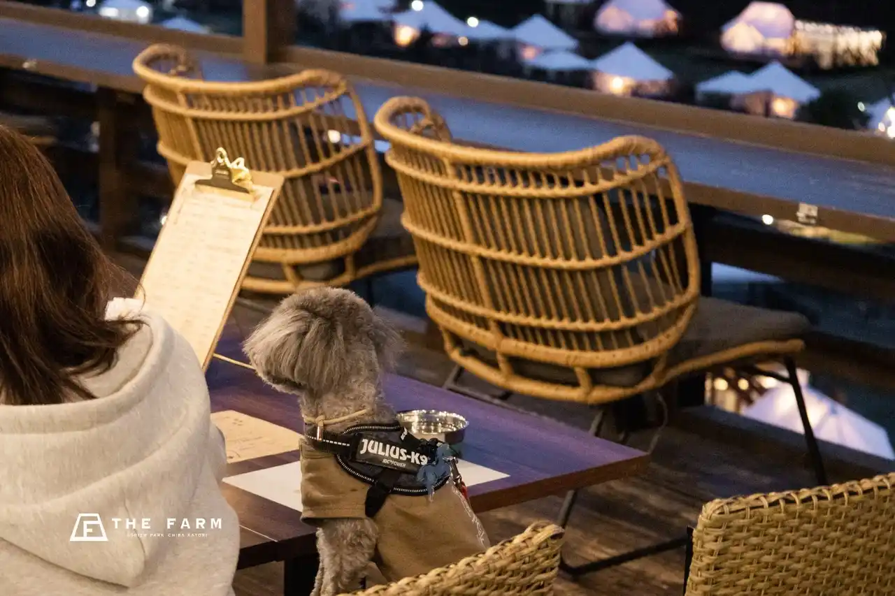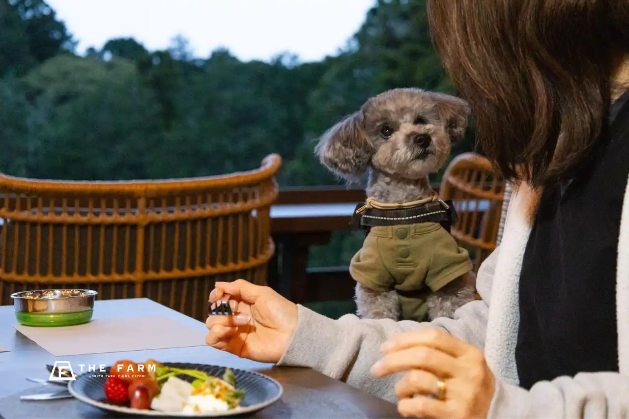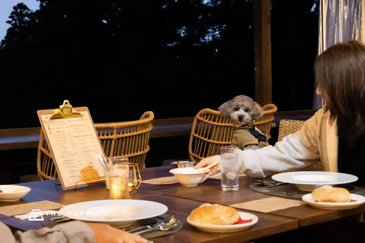 THE FARMが今回お届けしたいのは、単なる“ワンちゃん用メニュー”ではありません。広い敷地を歩き、芝生の上で遊び、日中の時間を楽しんだその先に、夜は同じ場所で一緒に食事を囲む。そんな一日の締めくくりとして、Doggy’s Dinner Courseを位置づけています。THE FARMカフェでは、もともとテラス席でワンちゃん同伴のお食事をご案内しており、金・土・日・祝には「Farmer’s Harvest Dinner」をお楽しみいただけます。今回の新メニューは、その夜の体験をさらに豊かにするものです。 |