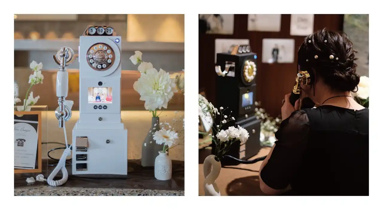 「anone」は、電話機をウェルカムスペースや式場内に設置し、ゲストが受話器を取って話すだけで、録音・録画が自動で開始される体験型サービスです。 その場で語られる祝福の言葉とともに、表情や仕草、その瞬間の空気感までも記録します。 |
