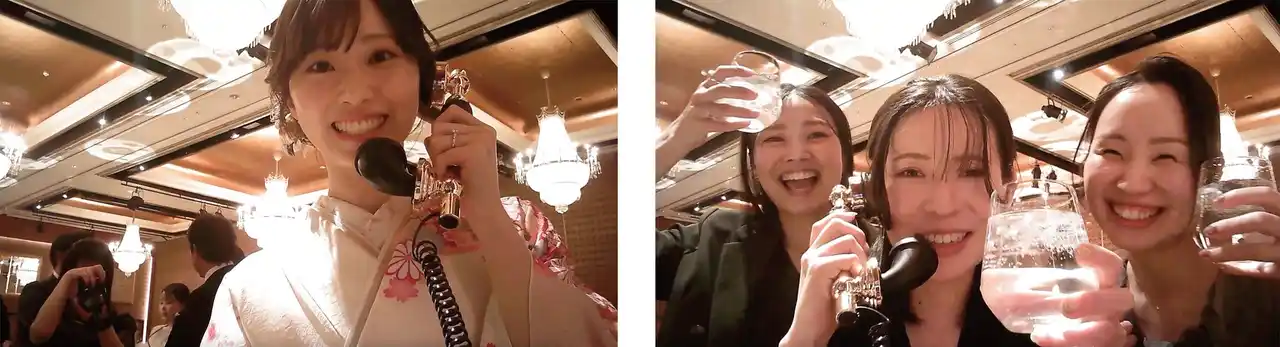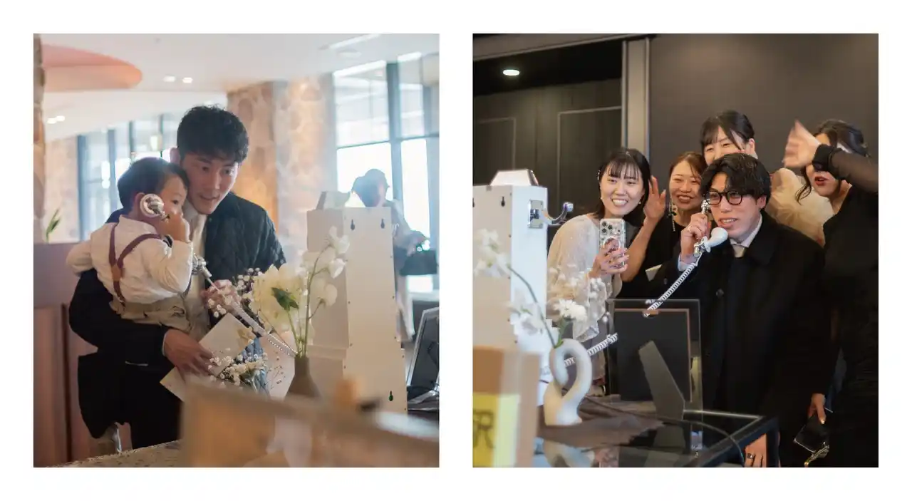 当日、式場に置かれた専用機器の受話器を取ると自動で録音・録画がスタート。ゲストは電話をかけるような感覚で、自由にメッセージを残すことができます。スピーチなどの形式ばったコミュニケーションとは異なり、短い一言や何気ない会話でも気軽に参加できるため、より多くのゲストの“その人らしい言葉”が集まるサービスです。 |
