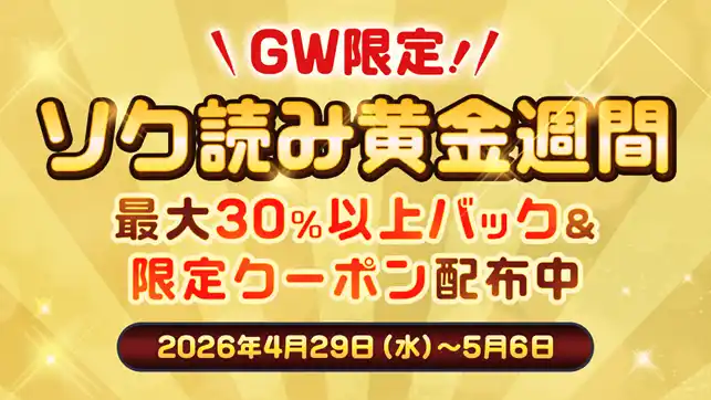 and factory 株式会社(本社:東京都目黒区、代表取締役社長:青木倫治、以下 and factory)が運営する「ソク読み」は、2026年4月29日(水)~2026年5月6日(水)の8日間にて最大30%以上ポイントバック&限定クーポン配布をする「ソク読み黄金週間」を実施いたします。 |