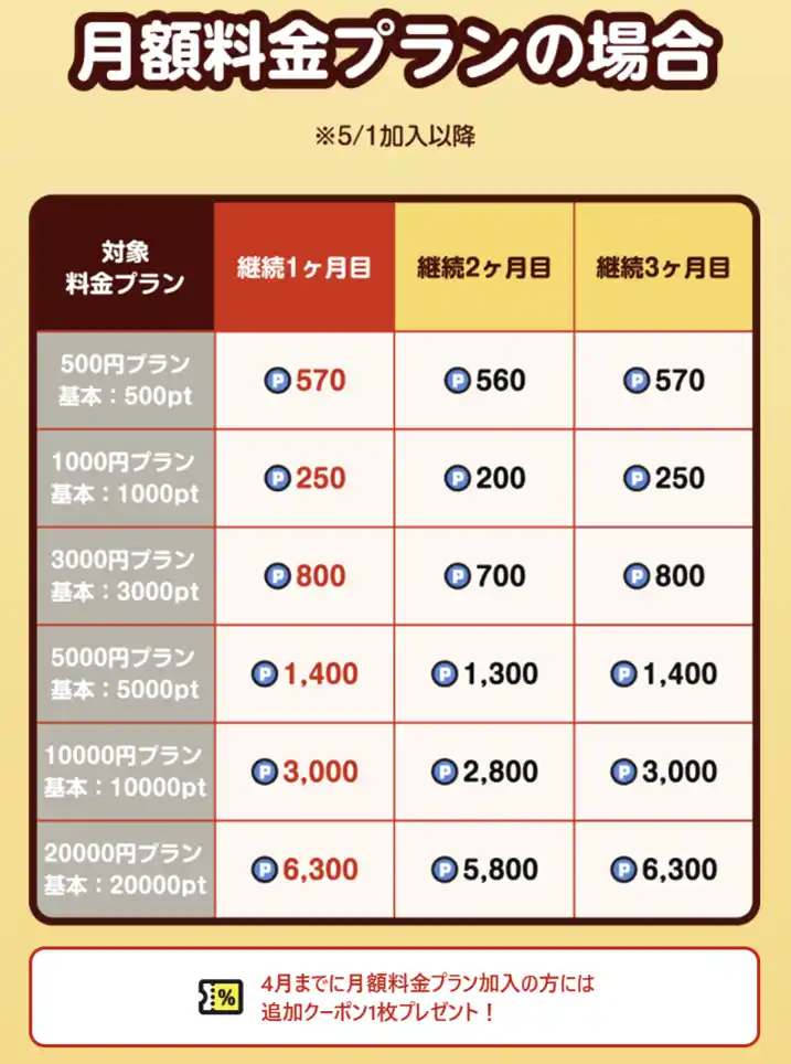 2026年5月1日より月額料金プランに入会すると1ヶ月目のボーナスポイントがお得に。さらに、4月までに月額料金プランに加入している会員にはお得に買える特別クーポンが配布されます。ポイントチャージも最大20%のボーナスポイントアップ! |
