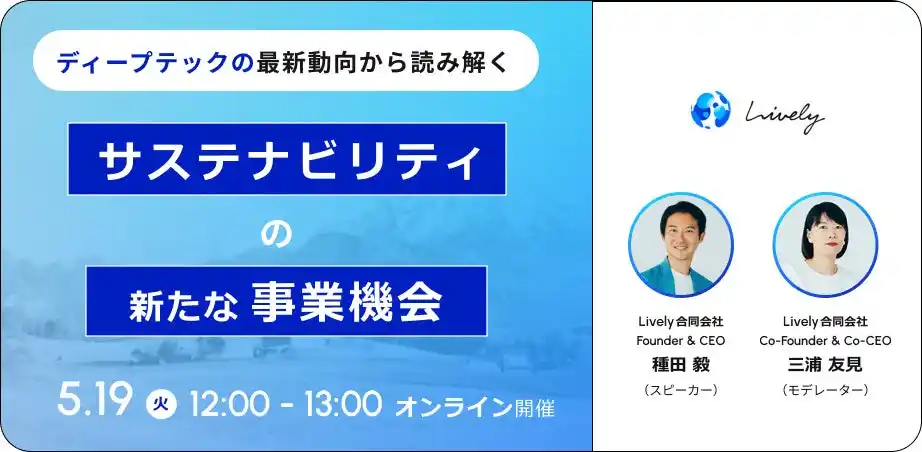 | 5月19日(火)12:00よりLively合同会社(東京都千代田区、Founder & CEO:種田 毅、Co-Founder & Co-CEO:三浦 友見)は、グローバル企業を対象に科学技術の進展を背景に注目を集める「ディープテック」を活用したサステナビリティの新たな事業機会について解説するウェビナー「ディープテックの最新動向から読み解く サステナビリティの新たな事業機会」を開催します。 | |||