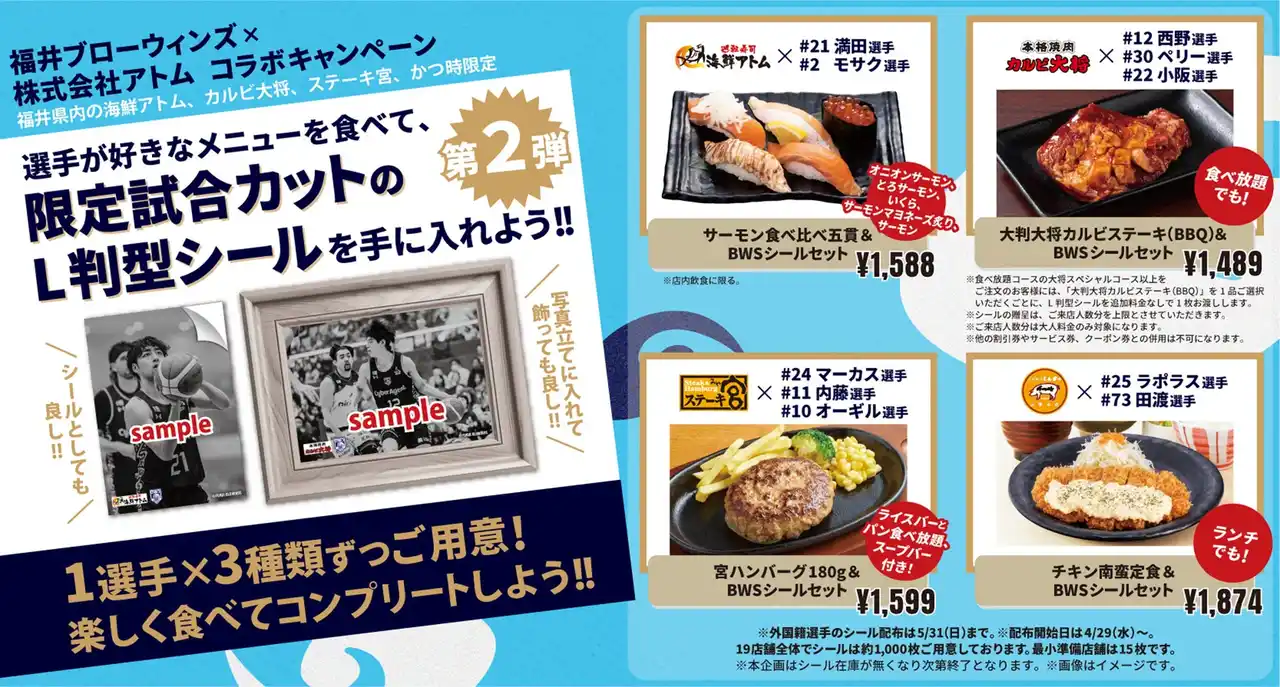 株式会社アトムは株式会社福井ブローウィンズとのコラボ企画として、選手の好きなメニューとオリジナルシールのセットメニューを販売いたします。第1弾とは異なる選手が登場しているので、この機会にぜひ全選手分を集めてみてはいかがでしょうか。 |