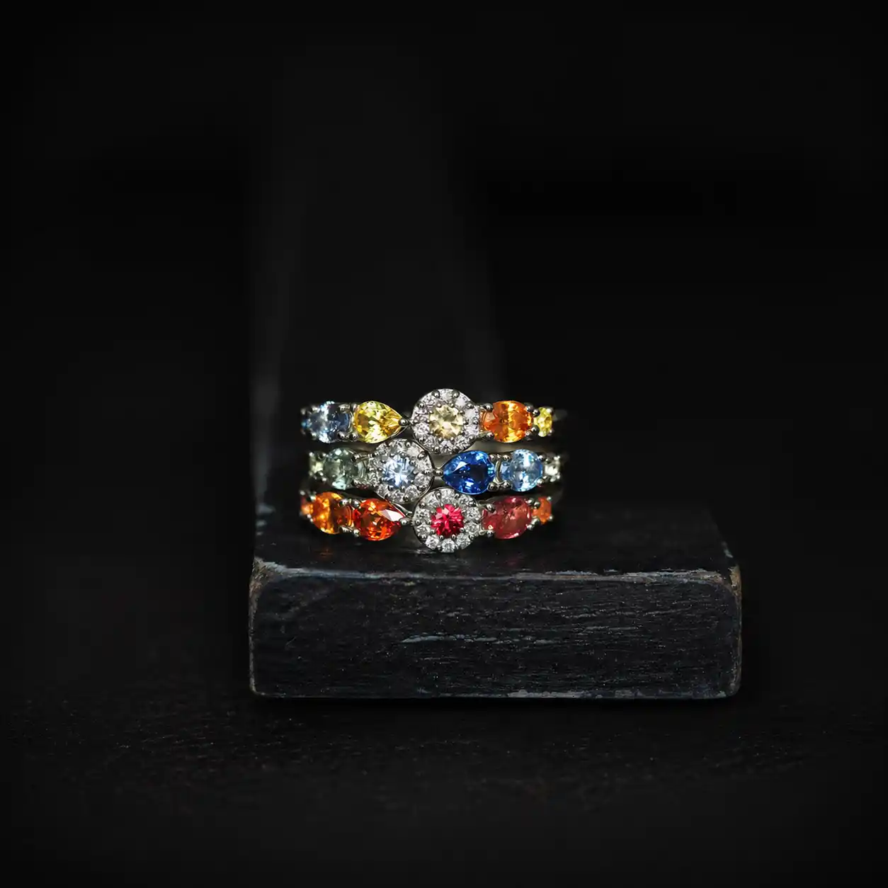 花束のように色彩が連なるCent Couleurを、今回はルビーとサファイアという同じコランダムに属する宝石のみを用い、ダイヤモンドとともに仕立てました。赤、青、イエロー、オレンジと、それぞれに異なる色調を宿しながらも、同じ鉱物ならではの透明感と輝きが全体に統一感をもたらし、華やかさのなかに端正な印象を生み出しています。 |