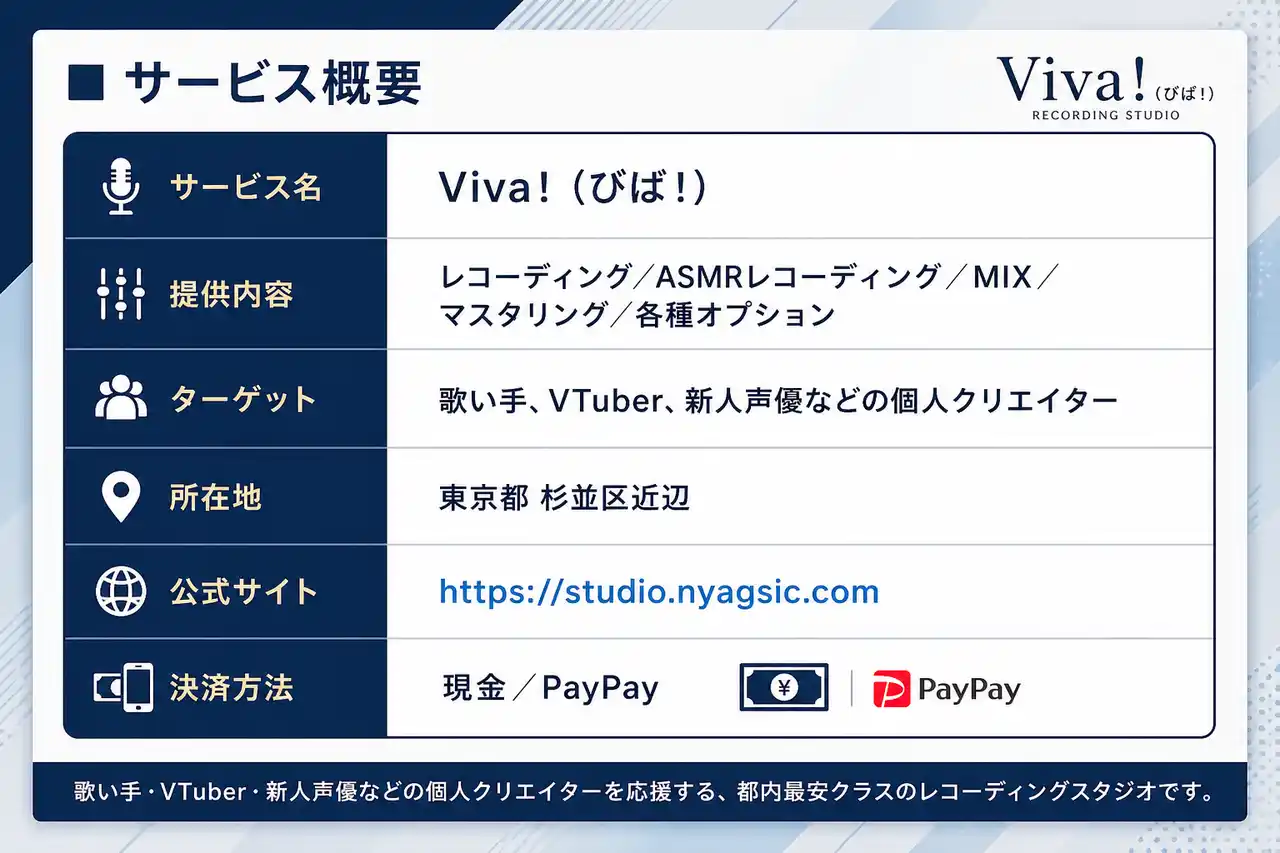 | レコーディングスタジオ Viva!(びば!)(所在地:東京都杉並区近辺、URL: https://studio.nyagsicapp.com)は、2026年4月、歌い手・VTuber・新人声優といった個人クリエイター向けに、**都内最安クラス**のレコーディング・ASMRレコーディング・MIX・マスタリングをワンストップで提供するスタジオとして新たにオープンいたしました。 | |||