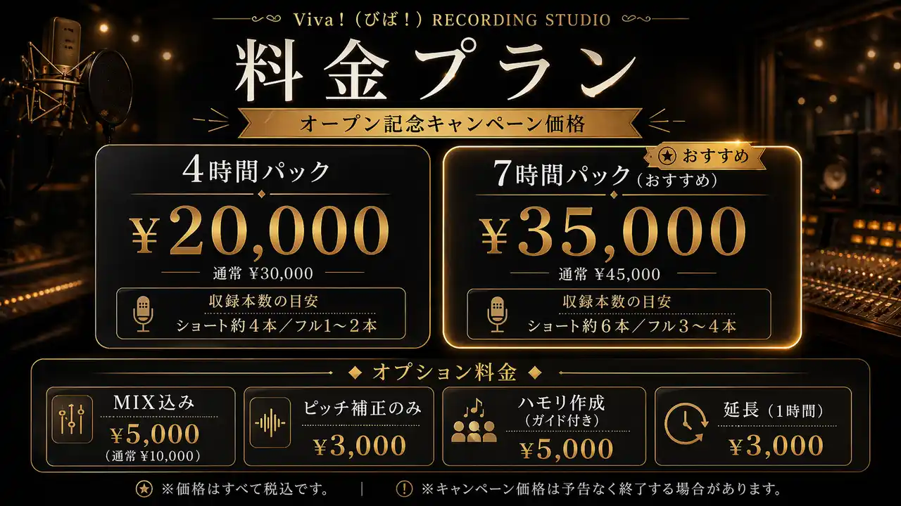 | ~プロ仕様機材×ワンストップ対応。オープン記念で4時間パック ¥20,000(税込)から~ |