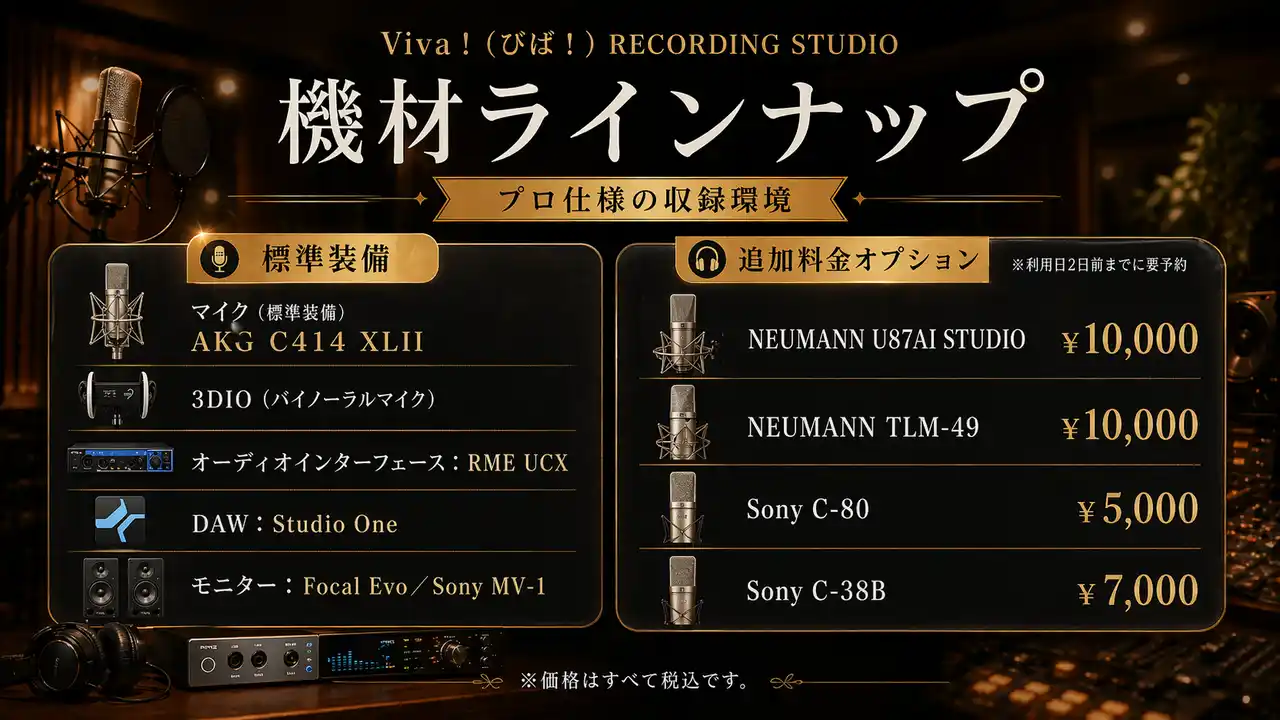 | - AKG C414 XLII/RME UCX/Studio One/Focal Evo などプロ仕様の機材を標準装備 | |||