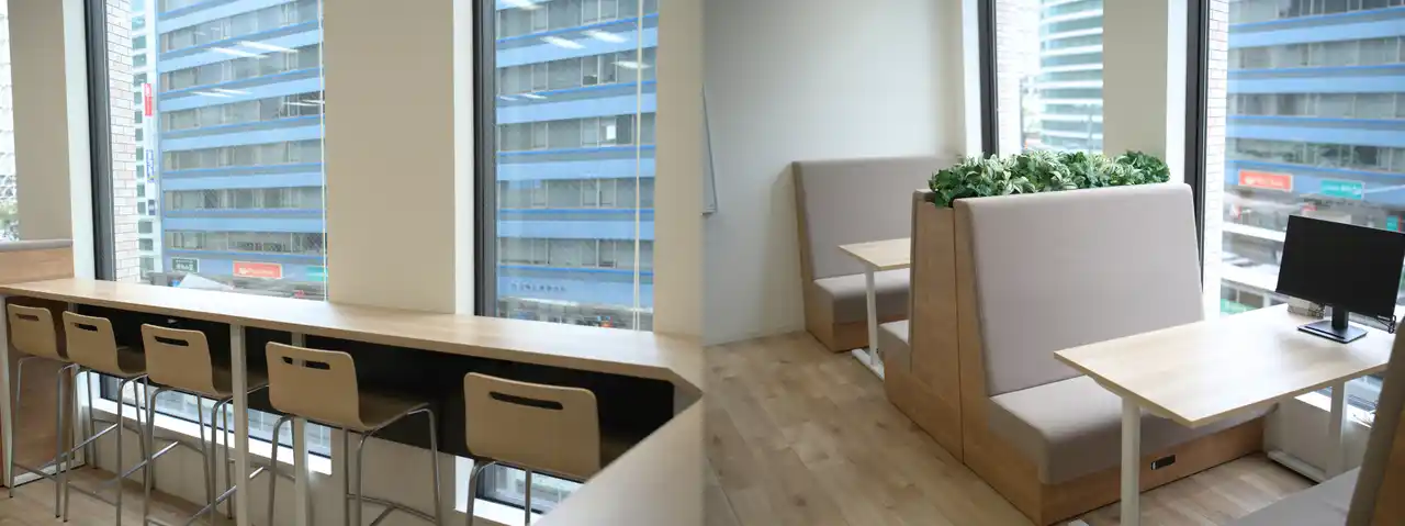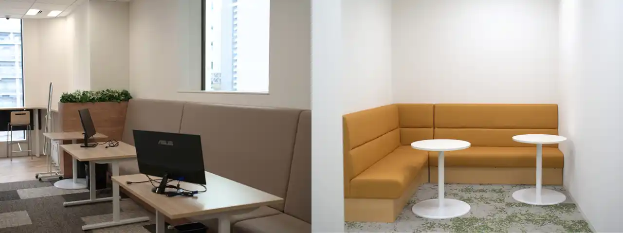 空間デザインには、木目やグリーンを基調としたナチュラルな雰囲気に、オレンジのアクセントを取り入れ、働きやすさと心地よさを両立しました。会議室の増設だけでなく、カウンター席、ソファスペースなどを設置しており、多様な働き方に対応するエリア構成としています。 |