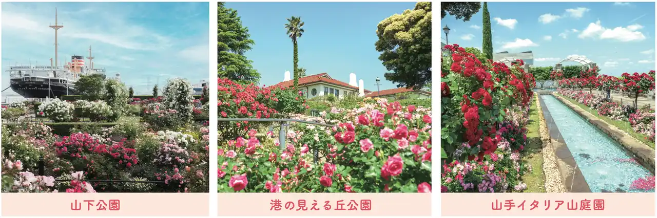 山下公園、港の見える丘公園、山手イタリア山庭園をはじめ、市内各所で色とりどりのバラが咲き誇り、フラダンスショー、マーケット、コンサート、マルシェ、街歩き企画など、多彩な催しを展開します。港を望むバラ園、異国情緒あふれる西洋館、緑豊かな公園、ショッピングストリートなど、横浜ならではの景観とバラが重なり合うこの時期だけの花風景をお楽しみいただけます。 |