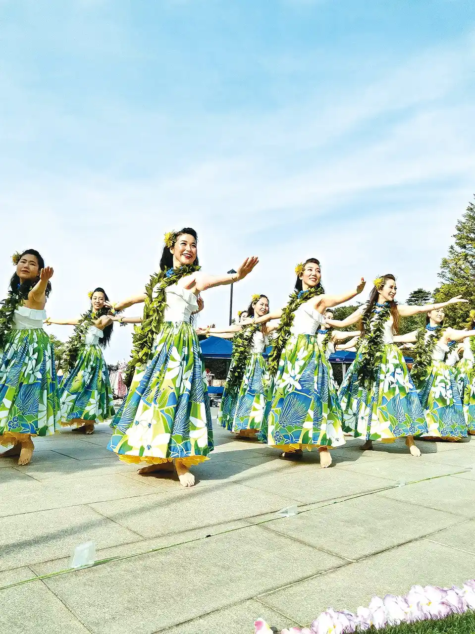 色鮮やかな花と緑に囲まれた公園で、華やかなフラダンスショーを開催します。 |