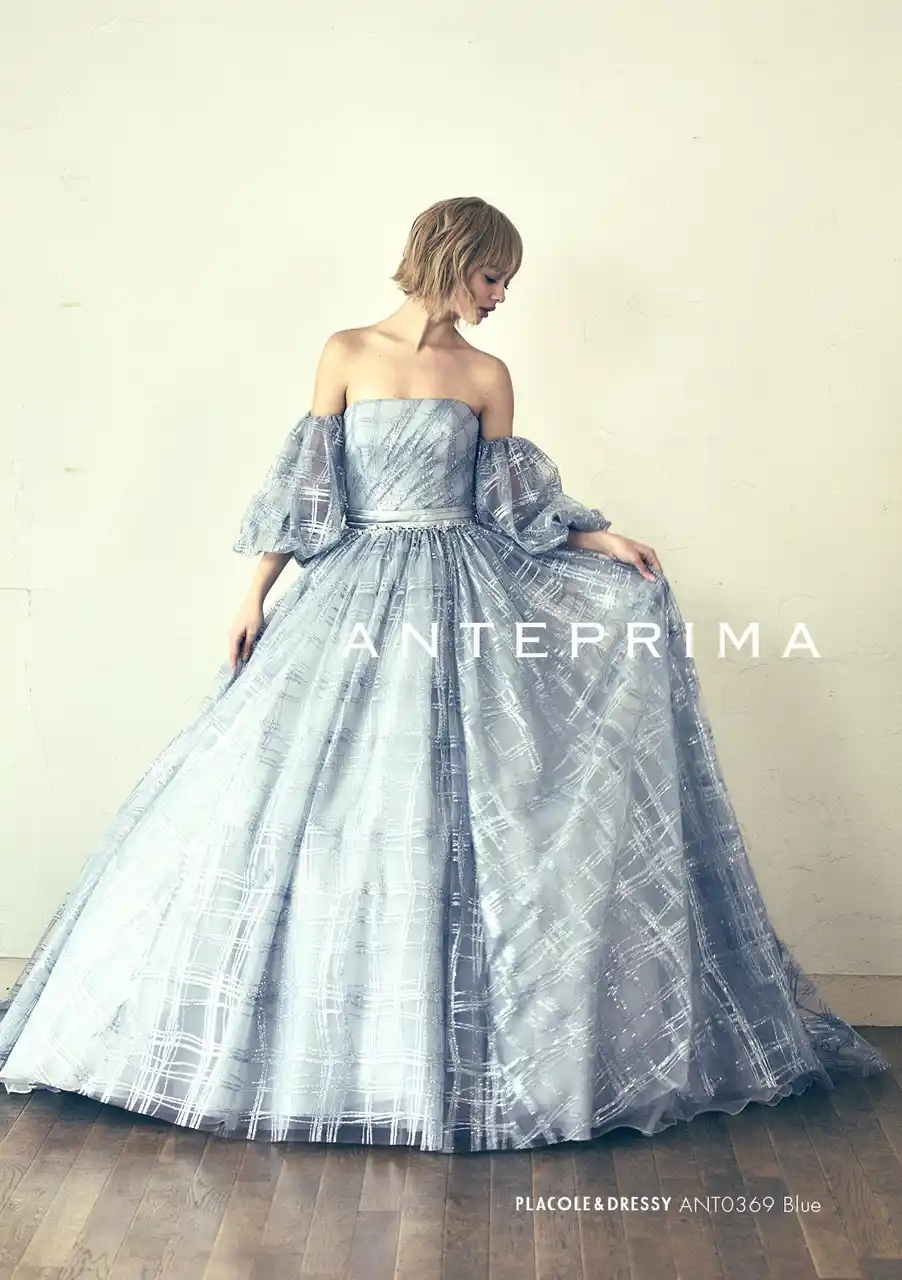 | 【ANTEPRIMA with PLACOLE & DRESSY Limited model】光の加減で表情を変える浅めのグリッターと、きれいめグレーを重ねたサックスブルーのチェックが印象的。アンテプリマで人気の格子編みミニバックからインスパイアしたテクスチャーと、メリハリのあるシルエットが印象を鮮やかに彩ります。パフスリーブでトップをコンパクトに見せ、スカートのボリュームとバランスよく仕上げたシルエットは、写真映えにも抜群の一枚です。 | |||||||||