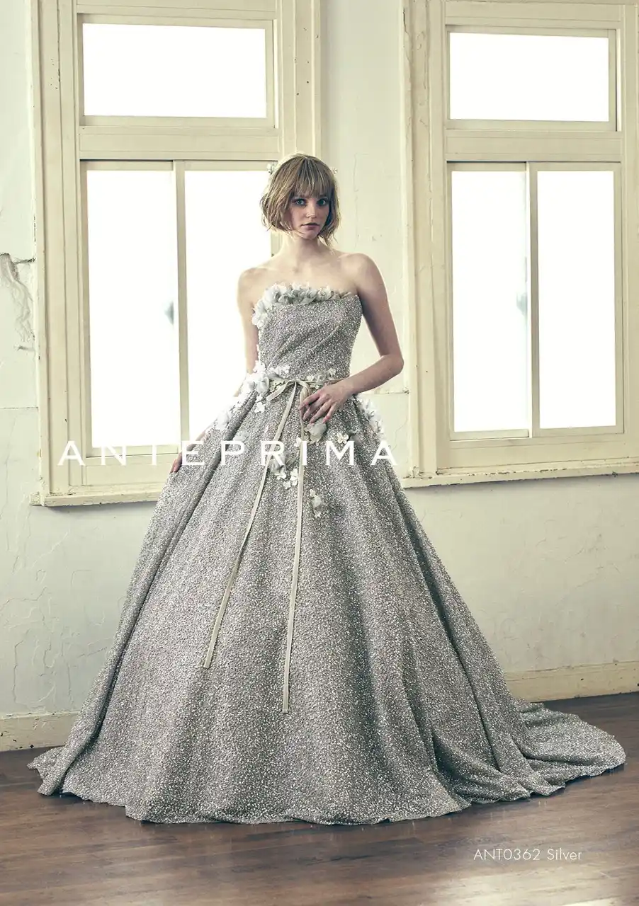 | 全身にあしらった新素材“プラチナグリッター”が、重厚感と立体感のあるきらめきを放ち、グラマラスな存在感を引き出す一着。そこに甘く軽やかなフラワーテクニックを重ね、クラシカルになりすぎない洗練された華やかさを演出。強さとロマンティックを併せ持つ、まるで名画のヒロインのような、印象的なカラードレスです。 | |||||||||
