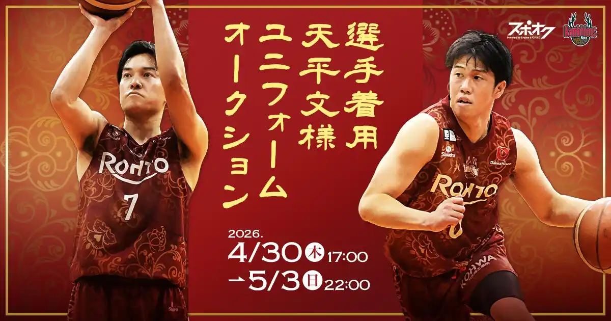 株式会社モバオク(本社:東京都渋谷区、代表取締役社長:小一原 宏樹、以下モバオク)がエンゲート株式会社(本社:東京都中央区、代表取締役:城戸 幸一郎、以下エンゲート)と業務提携し提供するスポーツチーム公式オークションサービス「スポオク」にて、B.LEAGUE所属のバンビシャス奈良が実施する『バンビシャス奈良 選手着用 天平文様ユニフォームオークション』が2026年4月30日(木)から開始されます。 |