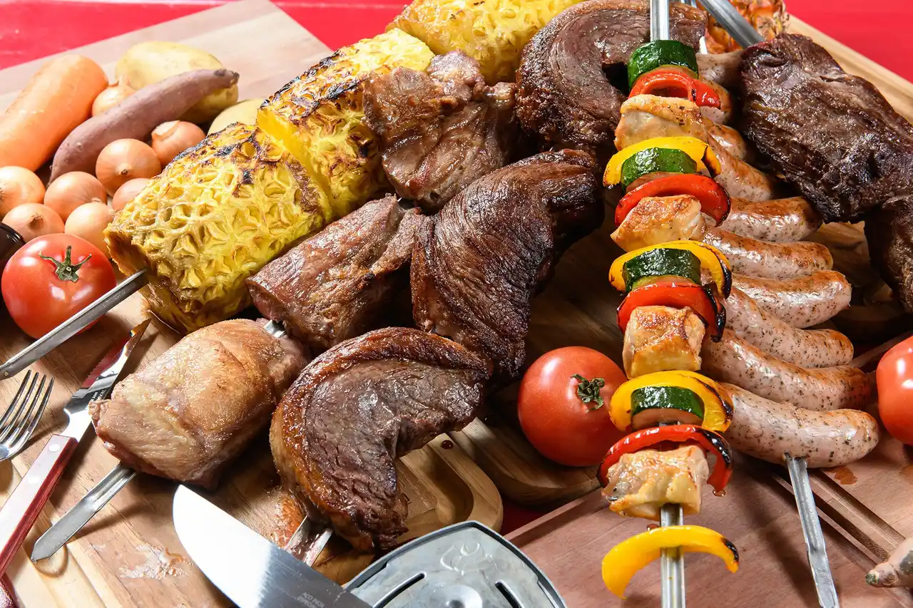 ■ 夕食:本格シュラスコ料理「Sul(スー)」 大串に刺した塊肉を目の前でダイナミックに切り分けるライブ感に加え、ブラジル人スタッフ直伝の「本場の家庭の味」を再現したサイドメニューが自慢です。18種のシュラスコが楽しめる「サンパウロコース」を提供いたします。 |