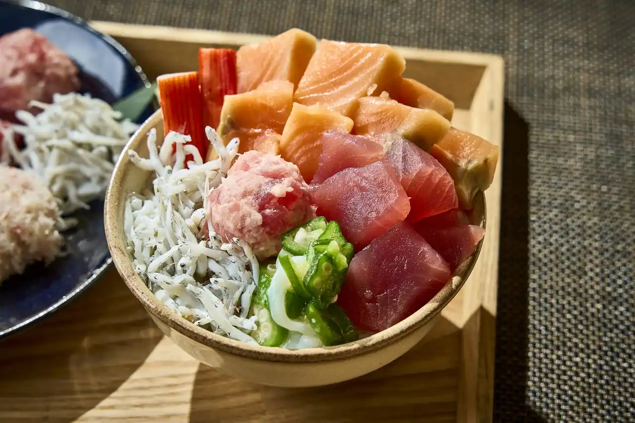 こだわりの和食: 大阪の台所「木津市場」から仕入れた新鮮な海鮮や、濃厚な黄身が特徴の「蘭王(らんおう)」の卵かけご飯。 |