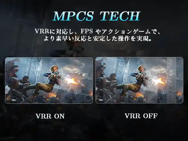 さらに、可変リフレッシュレート(VRR)に対応し、 ティアリングやカクつきを抑えた安定した表示を提供します。 |