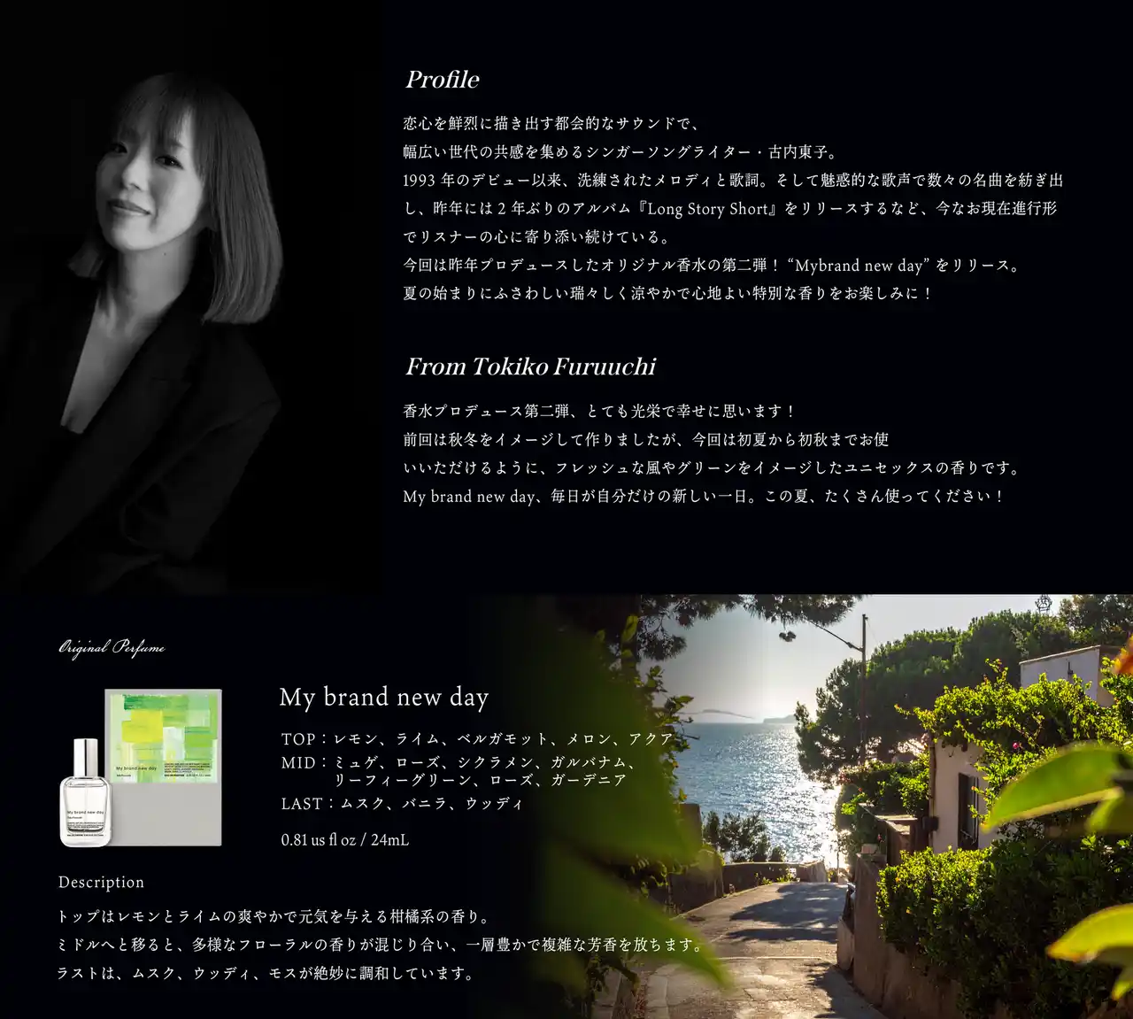 《古内東子コメント》 香水プロデュース第二弾、とても光栄で幸せに思います! 前回は秋冬をイメージして作りましたが、今回は初夏から初秋までお使いいただけるように、フレッシュな風やグリーンをイメージしたユニセックスの香りです。 My brand new day、毎日が自分だけの新しい一日。 この夏、たくさん使ってください! |