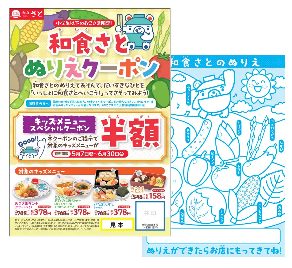 国内201店舗を展開する「和食さと」では、さとキッズくらぶ会員様に向けて、対象のキッズメニューが半額となるぬりえクーポンを配布します。お子さまの大切な人とだんらんのきっかけをつくる、特別なクーポンとなっております。さらに、和食さとでは4/23~5/6までの期間中「ゴールデンウイーク限定キャンペーン」を実施しており、小学生以下のすべてのお子さまにソフトクリーム(お子さま専用コーン)を1個プレゼントするキャンペーンも併せて実施中です!ぜひこの機会に和食さとへご家族そろってご来店ください。 |