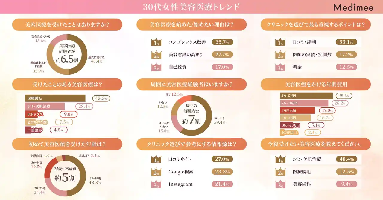 そこで今回Medimeeでは、30代の男女を対象に、美容医療の経験内容や始めた年齢、施術内容、クリニックの選び方、参考にする情報源、費用感について調査を実施しました。30代における美容医療の実態と、その選択プロセスを明らかにします。 |