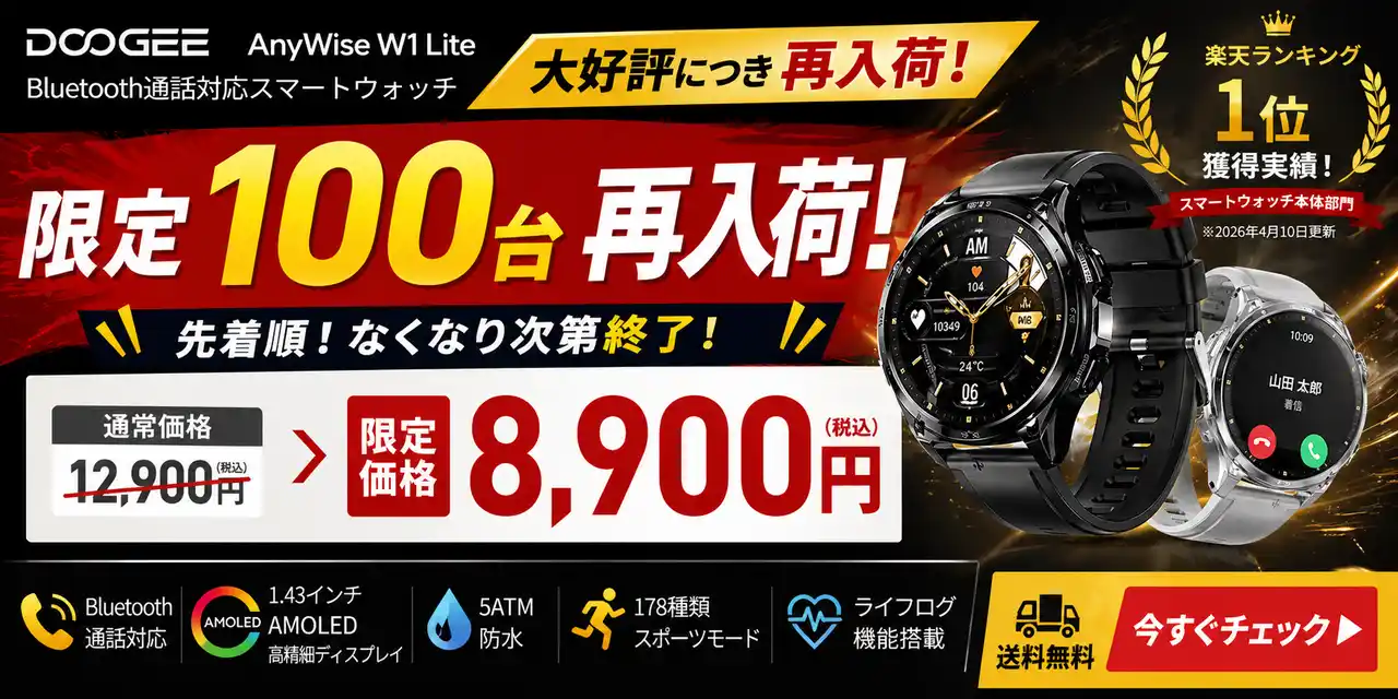 | 発売後即ヒットで一時完売。Bluetooth通話・5ATM防水搭載の話題モデルが数量限定で再販開始、先着100台の特別セール実施 |
