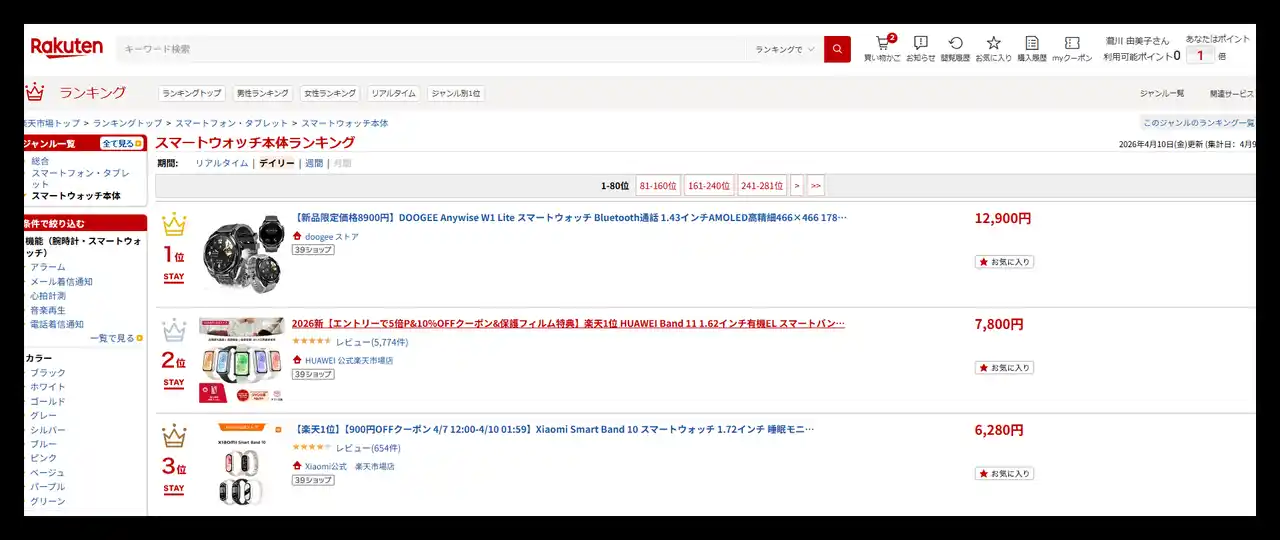 | その結果、楽天市場スマートウォッチ本体ランキング1位を獲得し、一時は在庫切れとなるほどの反響を記録しました。 | ||||||||||||||||||||||||