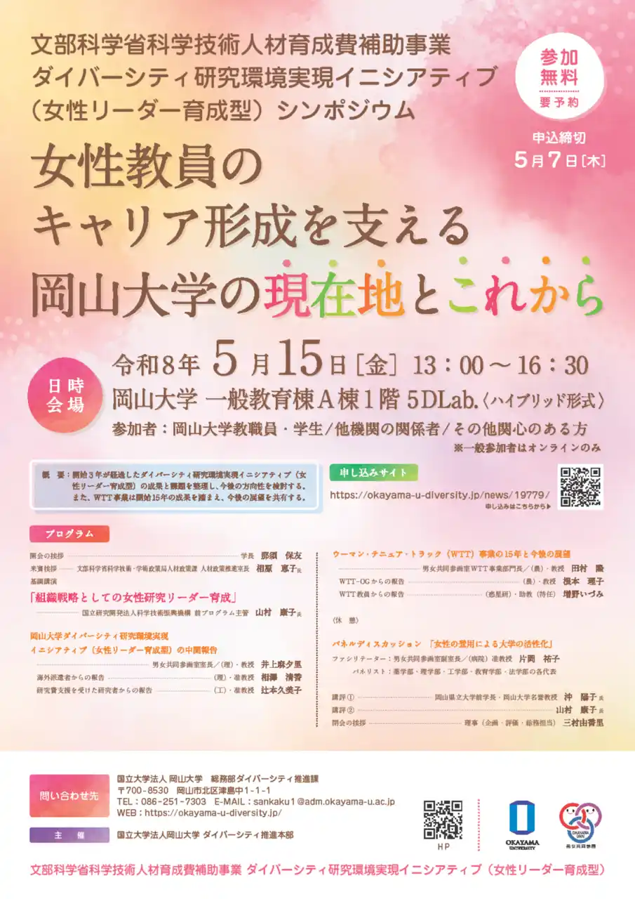 | 国立大学法人岡山大学(本部:岡山市北区、学長:那須保友)では、2026年5月15日(金)13:00~16:30に「ダイバーシティ研究環境実現イニシアティブ(リーダー育成型)シンポジウム-女性教員のキャリア形成を支える岡山大学の現在地とこれから-」を開催します。 | ||||