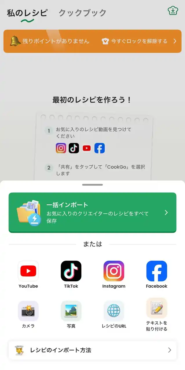 ★ 外部インポート:写真、SNSのリンク、テキストなどからレシピを即座に保存できます。 |