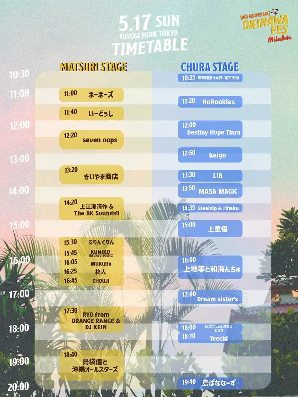 5月17日(日)のラストには、「島袋優と沖縄オールスターズ」によるスペシャルステージを予定しており、10周年を締めくくるにふさわしいフィナーレを迎えます。 |