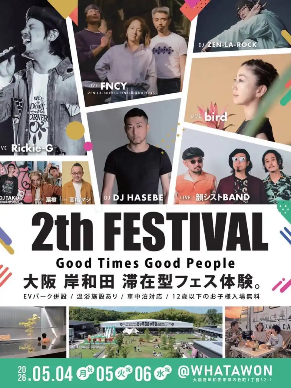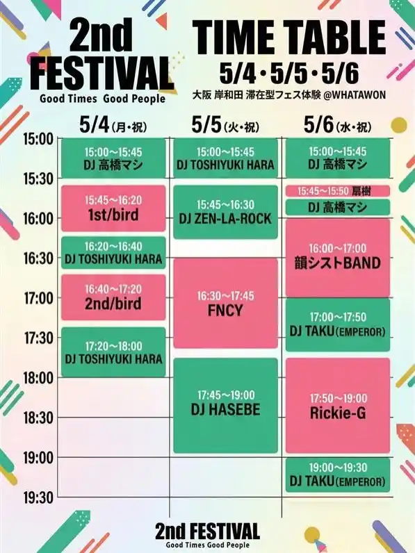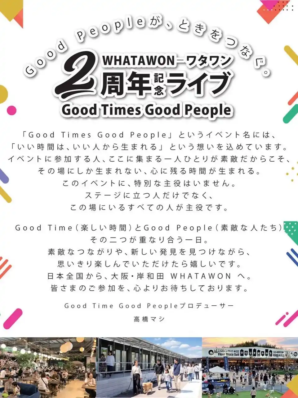 大阪・岸和田の滞在型エンターテインメントモール「WHATAWON(ワタワン)」で開催される 2周年記念大型フェス「Good Times Good People」のタイムテーブルが公開。 |