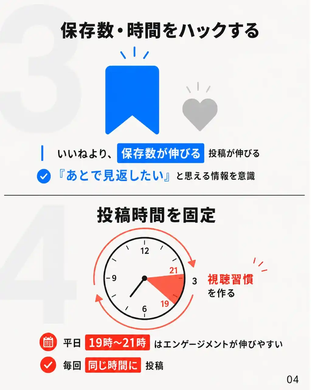 まず、ノウハウ解説コンテンツとしての活用です。マーケティングのコツや業務効率化のテクニック、業界知識の解説といった「読ませる学びコンテンツ」は、Instagramカルーセルで最も保存・シェアされやすいフォーマットの1つです。前述のSocialinsiderのデータ通り、カルーセル投稿はInstagramで最もエンゲージメントの高いフォーマットであり、スワイプを前提とした構成をAIが組んでくれるため、現場担当者が自ら高エンゲージメントを狙えるカルーセルを量産できます。 |