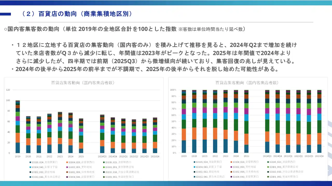 【販売額】20エリア合計の小売販売額は2025年もほぼ横ばいで推移。銀座・新宿駅西口・室町地域は安定を維持した一方、新宿3丁目(前年比▲3.6%)・渋谷公園通り商店街(▲3.9%)・池袋駅東口(▲19.5%)は減少。池袋駅東口は西武百貨店の営業規模縮小が主因だが、2025Q4では前期比+4.1%と回復の兆しが出始めた。 |