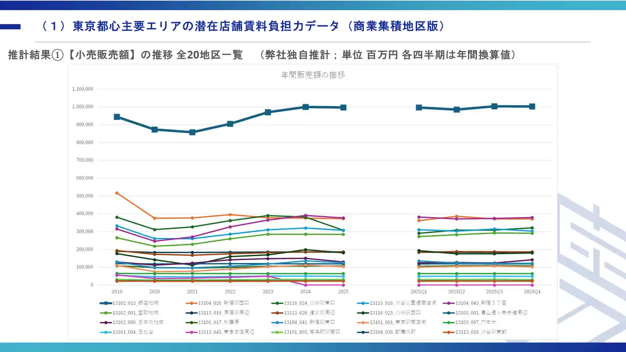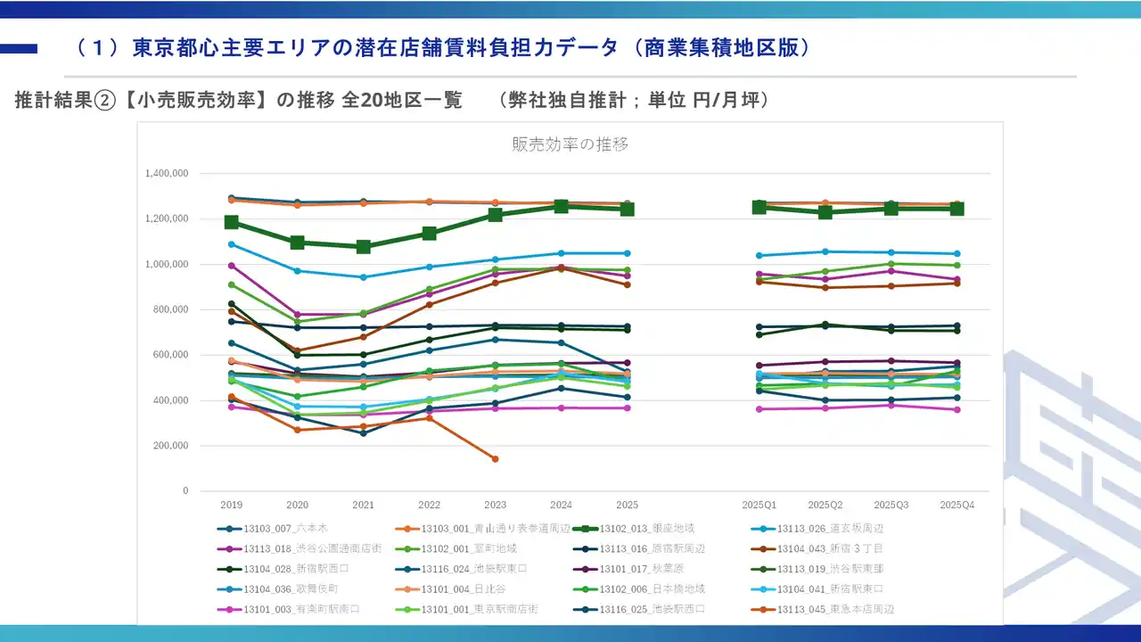 商業用不動産仲介事業を専門で取り扱っている株式会社ゼン・ランド(本社:東京都渋谷区、代表取締役社長 藤井善英、以下「当社」)は、人流データを活用し、東京都心主要6区(千代田区・中央区・港区・新宿区・渋谷区・豊島区)の商業集積地区20か所における小売販売額・販売効率の推移を推計した「東京都心商業エリアの潜在店舗賃料負担力データ 2025年第4四半期&年間まとめ」を公開いたしました。 |