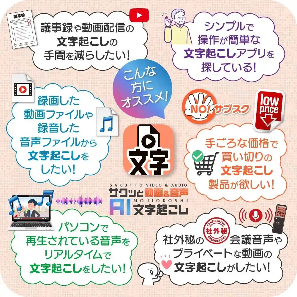 本製品は音声認識AIを活用し、動画・音声データを高精度にテキスト化できるソフトで、クラウドを使用することなくローカル環境で動作するため機密性の高いデータでも安心して利用できる点が特長です。 |