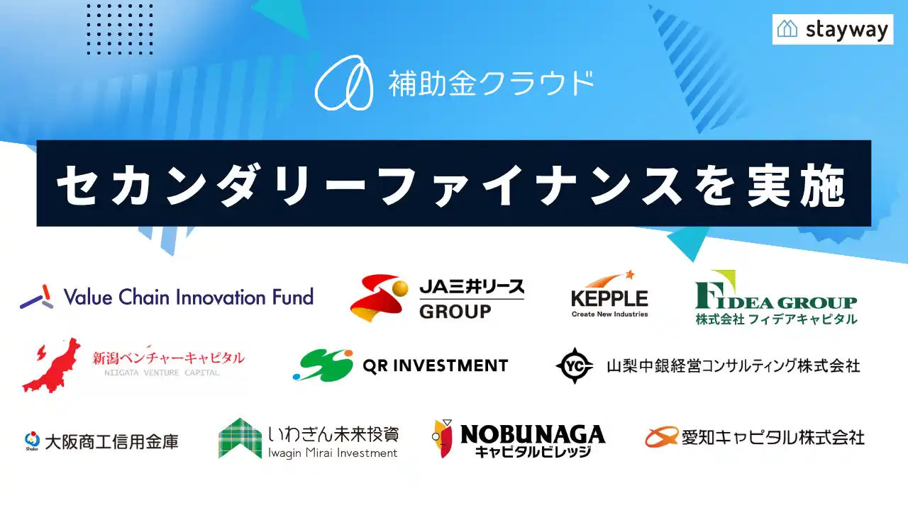補助金活用を通じた経営支援サービス「補助金クラウド」を運営する株式会社Stayway(本社:大阪府大阪市、代表取締役:佐藤 淳、以下「Stayway」)は、既存株主が保有する当社株式の一部について、地域金融機関や事業会社、ベンチャーキャピタルを引受先とするセカンダリーファイナンスを実施したことをお知らせいたします。 |