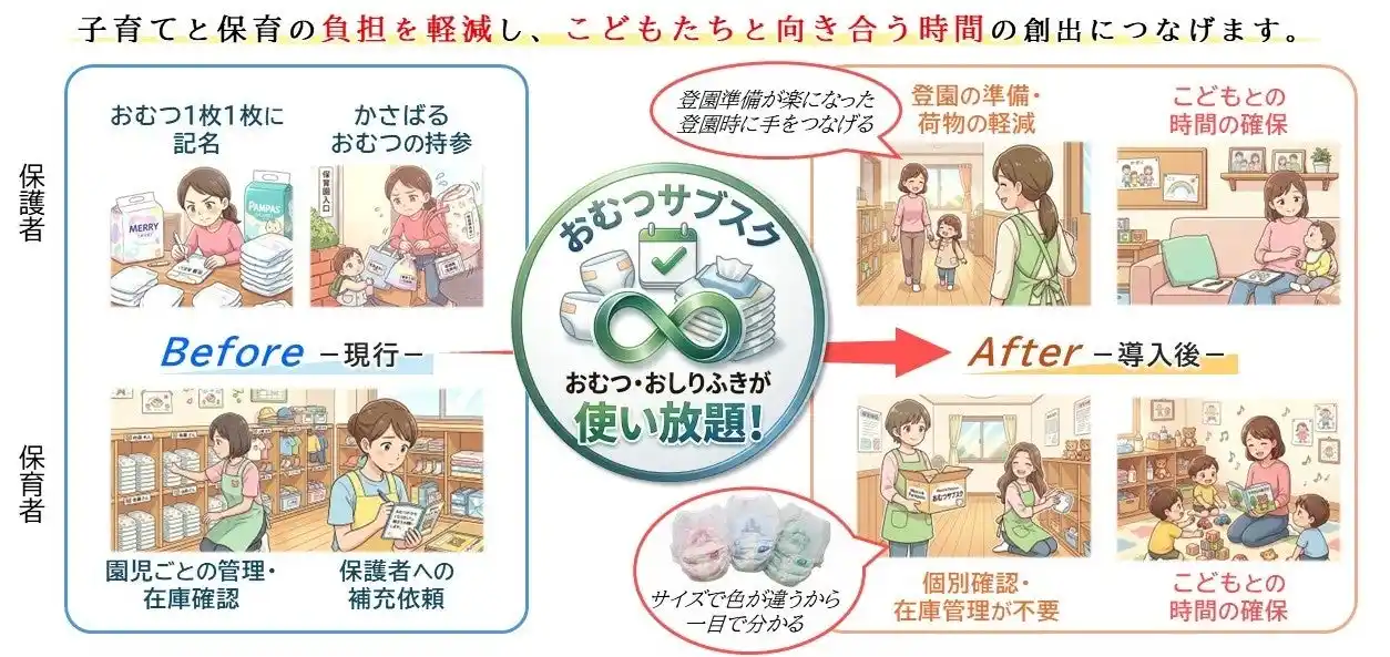 佐賀市では、県内10市で初となる取り組みとして、公立保育施設4か所で「おむつサブスク」を導入します。 本サービスは、2026年3月から無料トライアルを実施しており、2026年5月より本格運用を開始します。 |
