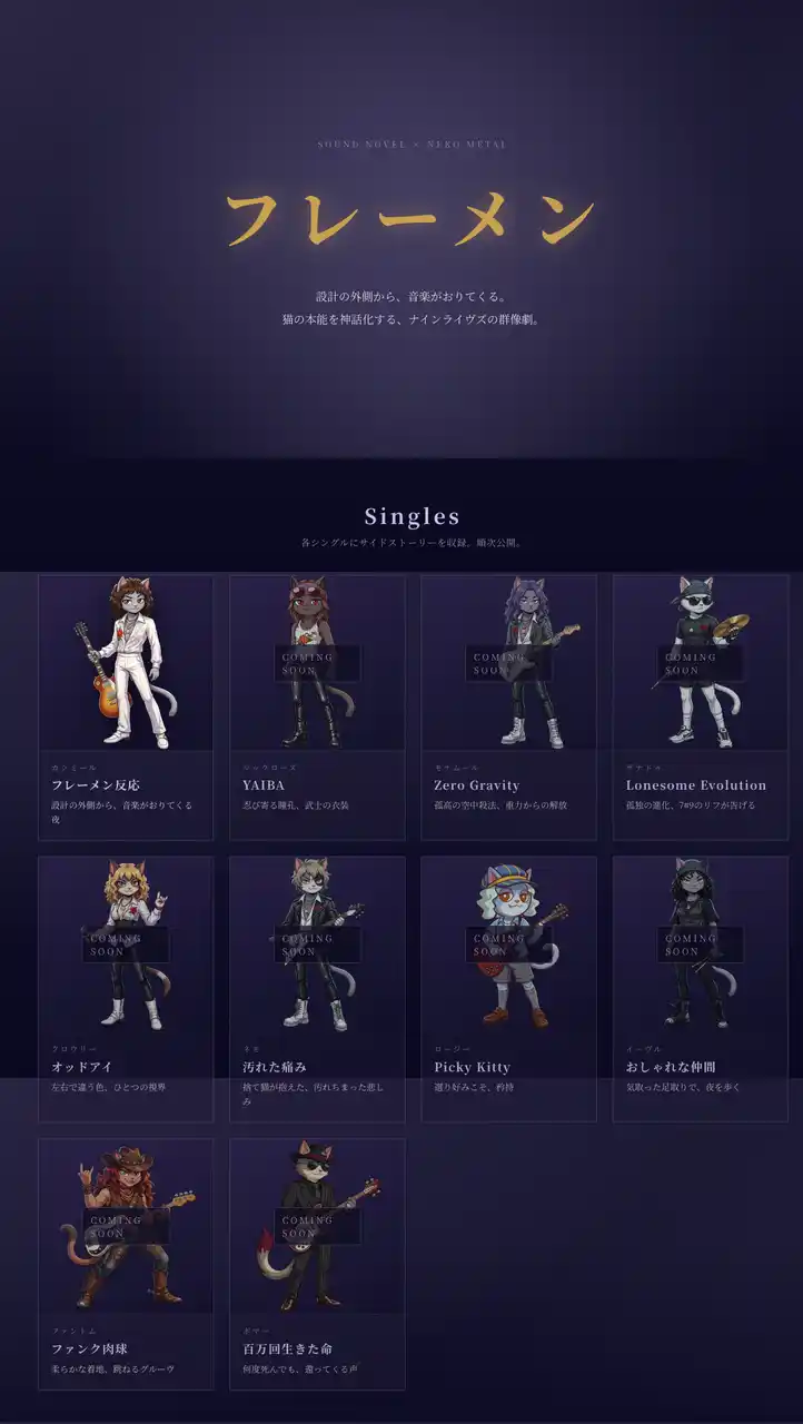 バンドメンバーはそれぞれ固有の背景と物語を持つキャラクターとして設計されており、楽曲リリースと連動したサイドストーリーを順次公開予定です。また、バンドの世界観を体験できるサウンドノベルゲームを現在開発中です。 |