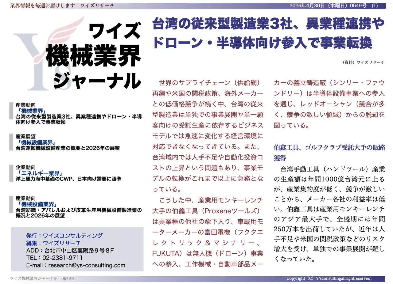 | ワイズコンサルティング グループ(本社:中華民国台北市、代表取締役:吉本康志)は台湾機械業界専門誌「ワイズ機械業界ジャーナル」の2026年4月第5週号を発行しました。 | ||||