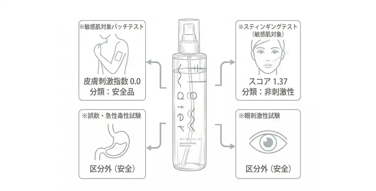 肌にのせるものだからこそ、FlowFlowは製品の安全性に正面から向き合ってきました。フローフローウォーターは、第三者機関による複数の試験を経て製品化されており、その結果を開示しています。 |