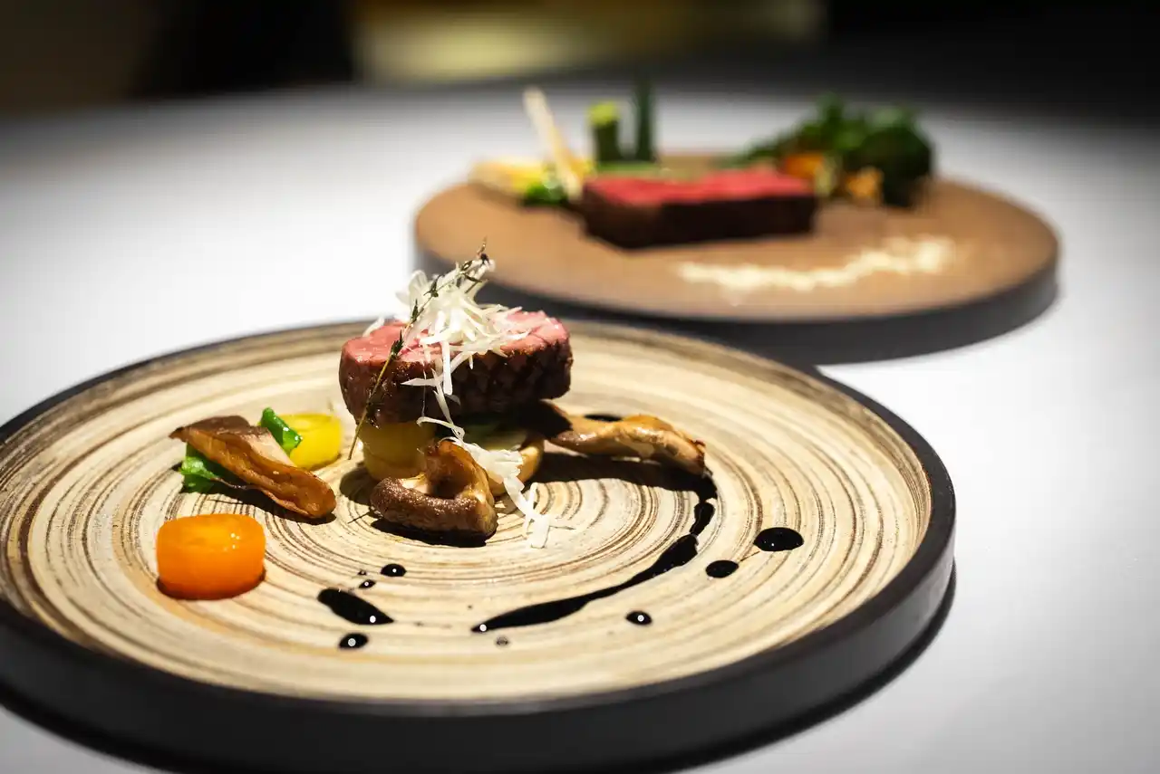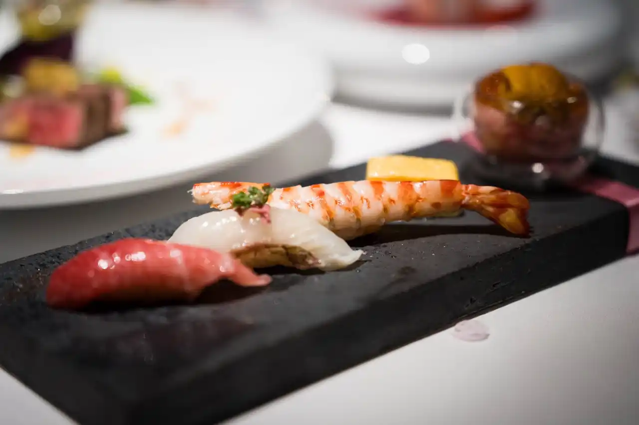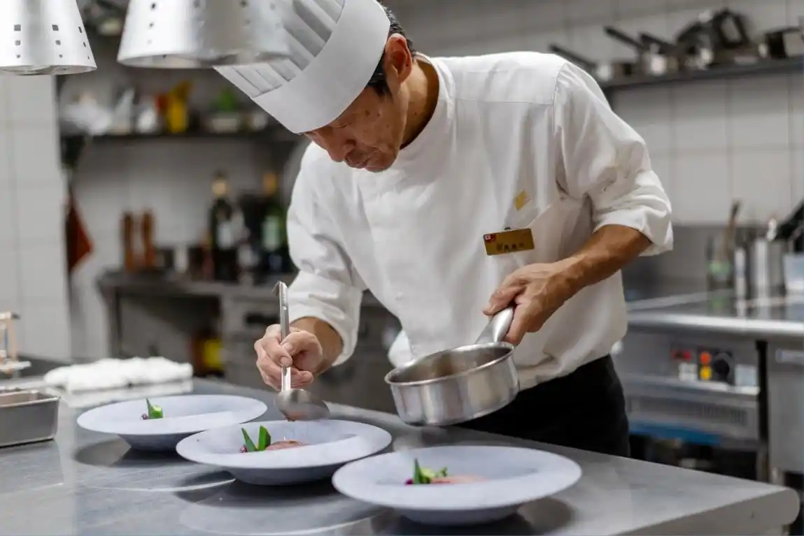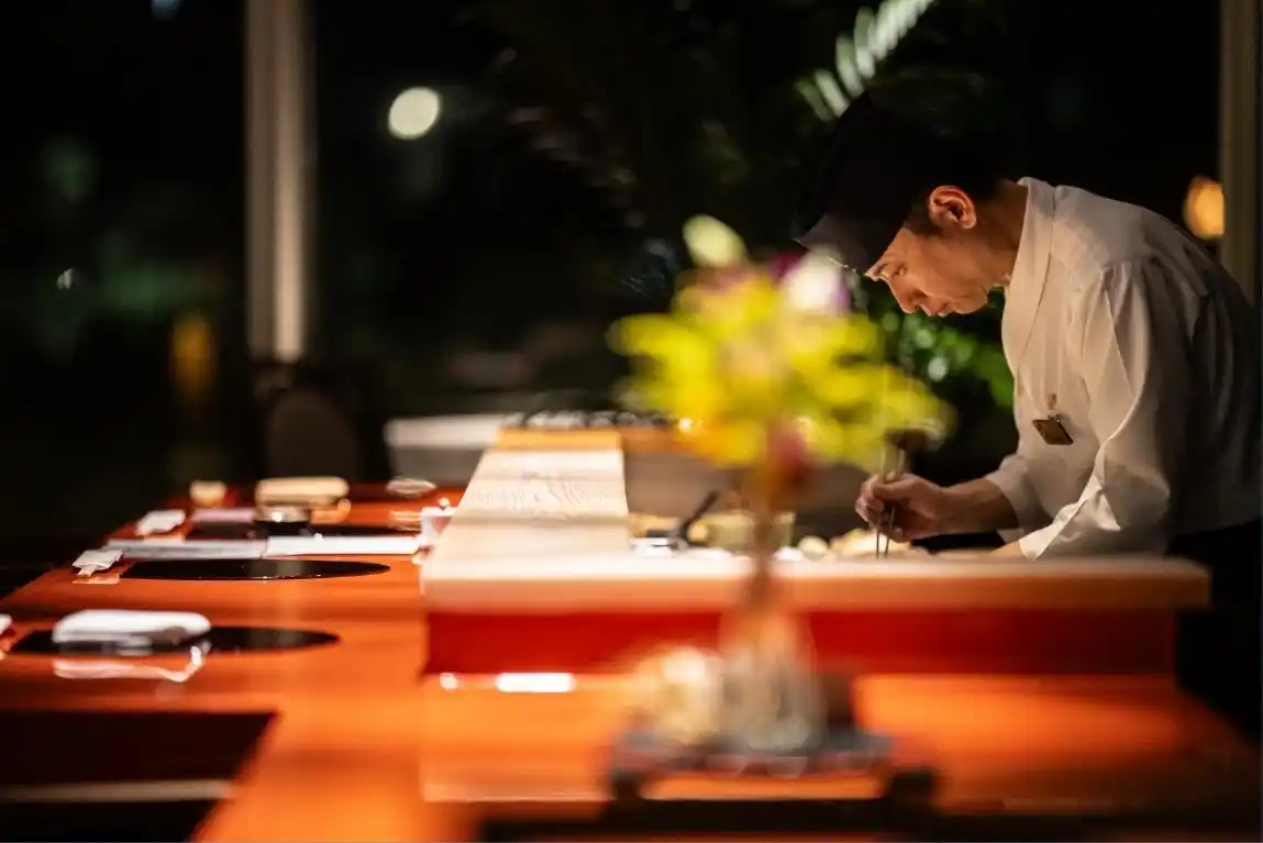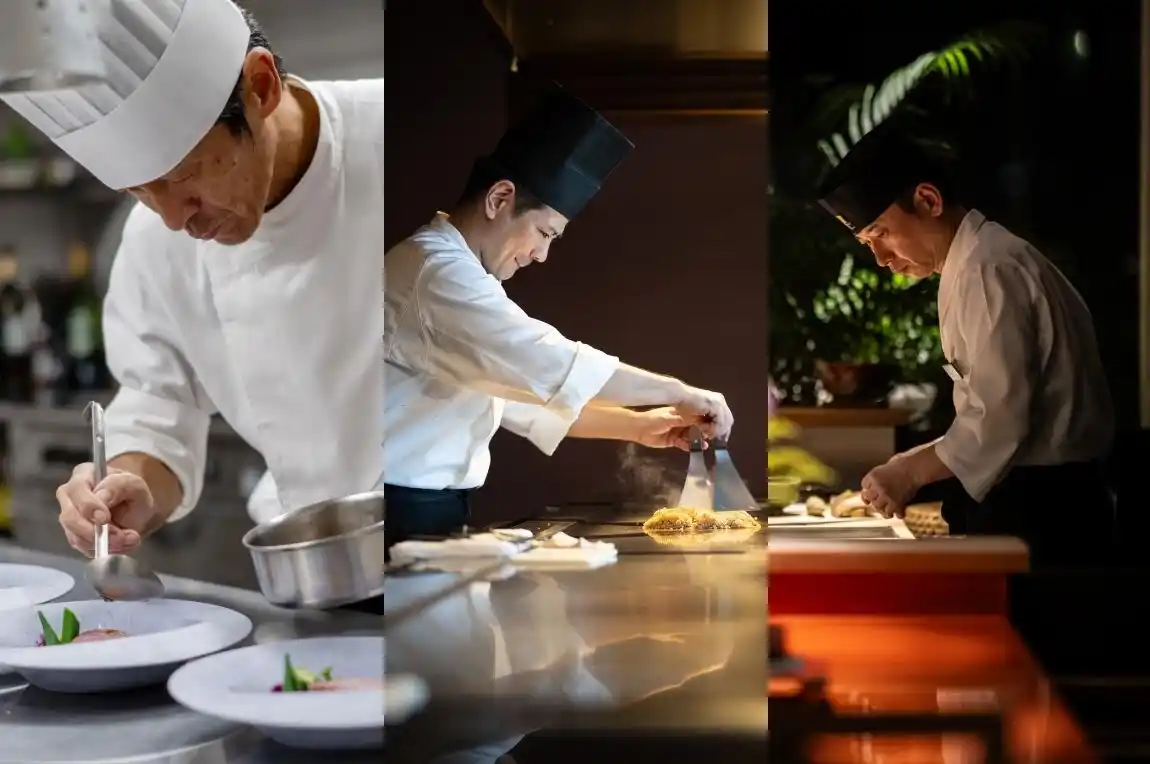 オリエンタルヒルズ沖縄には、フレンチ・鉄板焼き・江戸前鮨の3ジャンルを担う料理長が常駐しております。全14棟のスイートヴィラに滞在されるお客様のためだけに、それぞれが長年培ってきた技と感性を生かした料理をご提供しています。 |