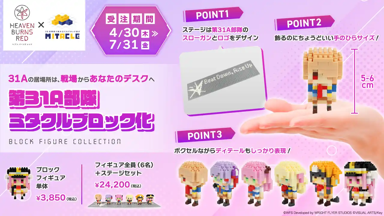 株式会社G-ant(所在地:東京都中央区、代表取締役:平川 彰悟)は、ライトフライヤースタジオ × Keyが贈るドラマチックRPG『ヘブンバーンズレッド』とのコラボレーションとして、ボクセル技術を活用した組み立てフィギュア「ミタクルブロック」の新商品6種+コンプリートセットを発売いたします。主人公・茅森月歌が所属する第31A部隊6名が、それぞれミタクルブロック化。