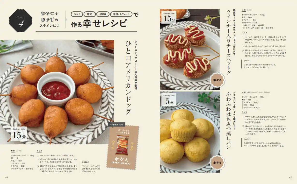 「おうちにある材料で、家族が喜ぶおやつやおかずを作りたい!」という願いを叶えるのがこのパートです。ホットケーキミックスや寒天、切り餅、冷凍パイシートといった身近な食材を活用したレシピが満載です。手作りとは思えない仕上がりに、家族も驚くこと間違いなしですよ。 |