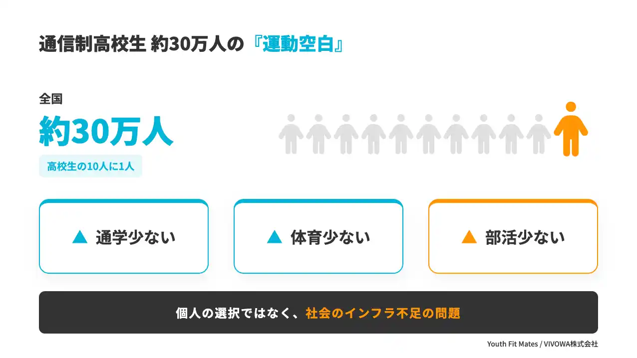 | 通信制高校生向けウェルビーイングを手がけるVIVOWA株式会社(東京都渋谷区、代表取締役 山内皓貴)は、その現実を変えるための「新しい体育」として、フィットネスプログラム「Youth Fit Mates」を、2026年6月1日(月)に本格始動。第1期生として、全国から40名を募集します。参加は無料です。 | |||