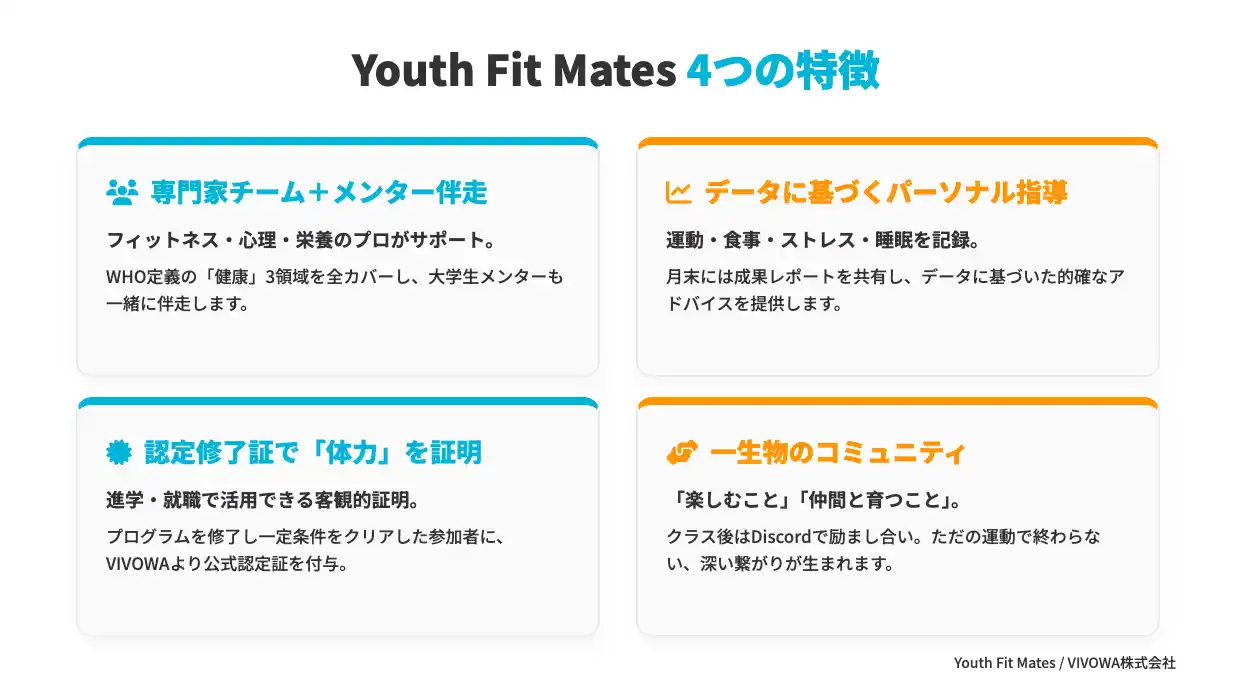 ▶ プロ専門家チーム+メンターが伴走「ただのフィットネス」ではない、新しい体育です。 心と体と栄養を、それぞれの専門家が伴走します。 ・フィットネス:皆川 慶太(NY/LAで10年以上活躍のプロトレーナー 世界最先端Equinox出身) ・コミュニティづくり:山内 皓貴(VIVOWA代表/元 角川ドワンゴ学園) ・公認心理師・管理栄養士などの専門家チームがサポート さらに、通信制高校の卒業生を中心とした大学生年代のメンターも、参加者と一緒に運動しながら、運動の継続や振り返りをサポートします。 WHO定義の「健康」3領域(身体・精神・社会的)を全カバー。2ヶ月で「日常で体力を自信にできる」レベルを目指します。 ▶ データに基づくパーソナルサポート クラスのたびに、運動・食事・ストレス・睡眠のデータを記録。月末には運動成果のレポートを共有し、データに基づいたトレーナーからのアドバイスも受けられます。 ▶ 認定修了証で「体力」を社会に証明できる一定の条件をクリアした参加者には、トレーナーおよびVIVOWAから「認定修了証」を付与いたします。通信制高校生が「自分には十分な体力がある」ことを社会に対して説明できる客観的な証明として、進学や就職の場面でも活用いただけます。 ▶ ただの運動プログラムではない、一生物のコミュニティYouth Fit Matesが大切にしているのは「楽しむこと」と「仲間と育つこと」。クラス後はDiscordで励まし合い、参加者同士がプログラム以外の場で出会う報告も届いています。「一生物のコミュニティ」が、ここにできている自信があります。 |