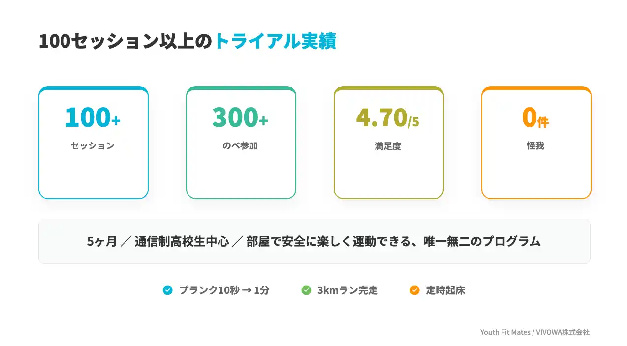 VIVOWAはこれまで、5ヶ月にわたり通信制高校生を中心にトライアルを重ねてきました。実施したセッションは100回以上、のべ参加者は300人を超え、怪我の報告は一切ありません。部屋で安全に、楽しく運動できるプログラムとして、私たちは唯一無二の存在だと考えています。 ▶ 実施セッション:100回以上 ▶ のべ参加者:300名以上 ▶ 満足度:4.70 / 5 ▶ 怪我報告:ゼロ参加生徒の変化 (実証例):プランク10秒が1ヶ月で1分に/運動習慣がほとんどなかった生徒が3kmラン完走/朝起きられなかった生徒が決まった時間起床できるようになる ▶ 参加生徒のコメント 「一緒に運動する仲間がいて励まし合えることで続けられている。クラス以外でも運動するようになってきた。」(女性参加者) 「運動する機会が著しく少なくなってしまいましたが、Youth Fit Matesのおかげで運動習慣を維持することができました!クラスでは慣れない動きに関しても丁寧に指導してくださっており、私自身の成長も実感しています。健康を維持することに、Youth Fit Matesには非常に助かっています!」 (男性参加者) 「画面OFFでも参加していいから、気軽に参加できるのが嬉しい。」(女性参加者) |