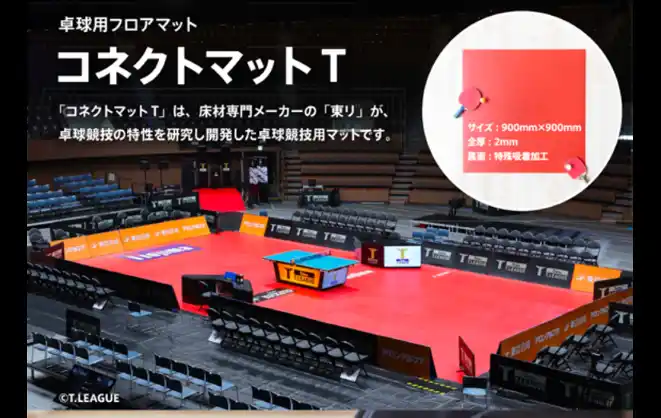 | Tリーグの男子・女子公式試合において使用されている、東リ株式会社(本社:兵庫県伊丹市、代表取締役社長:永嶋 元博)製の卓球用フロアマット「コネクトマットT」が、このたび国際卓球連盟(ITTF)、ならびに、公益財団法人日本卓球協会(JTTA)の公認フロアとして認定されましたことをお知らせいたします 。 | |||||||||