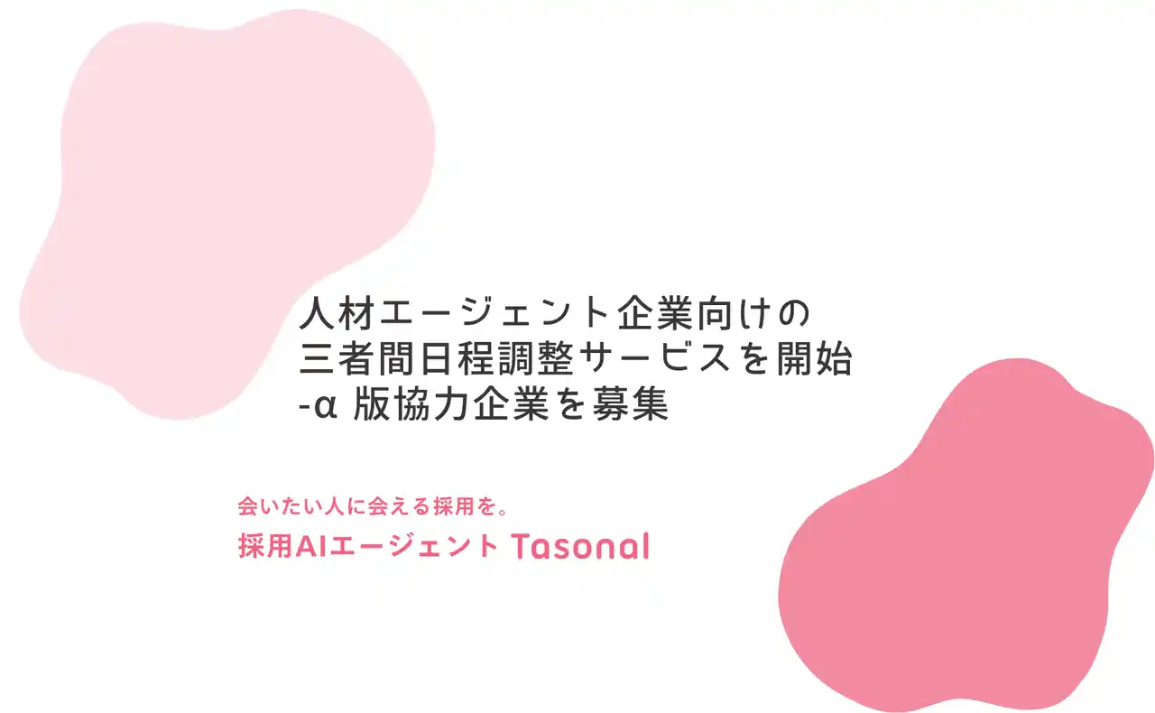 | 採用領域のAIサービスを提供する株式会社SAIRAI(本社:東京都新宿区、代表取締役CEO:平井瑞樹)は、人材紹介エージェント向けAI採用オペレーション基盤「Tasonal for Agents」において、三者間日程調整機能のα版を提供中であることをお知らせいたします。あわせて、2026年6月のベータ版(有料版)リリースに向け、事前登録およびテスト協力企業の募集を開始いたしました。 | ||||||||||||