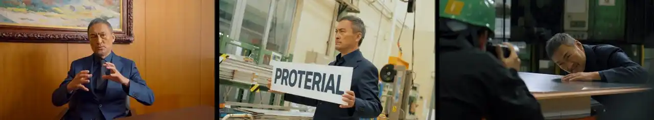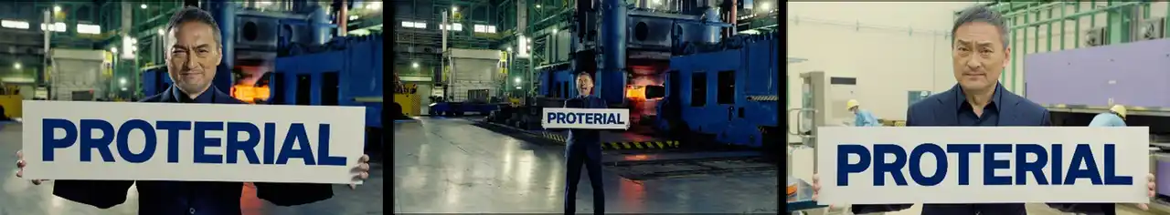 今回の新CMでは、渡辺謙さんが当社が誇る大迫力の生産現場に登場します。真っ赤に熱された金属塊が鍛造されるダイナミックな環境の中で、あるいは、最先端の技術が光る精密な開発の現場で、プロテリアルの社名が書かれたボードを手に、稼働音に負けじと真っ直ぐに語りかけます。社名を何度も繰り返す演出には、「プロテリアルを知ってもらいたい」というメッセージが込められており、渡辺謙さんの圧倒的な熱量と説得力のある演技によって、プロテリアルの揺るぎない決意を体現する内容となっています。 |